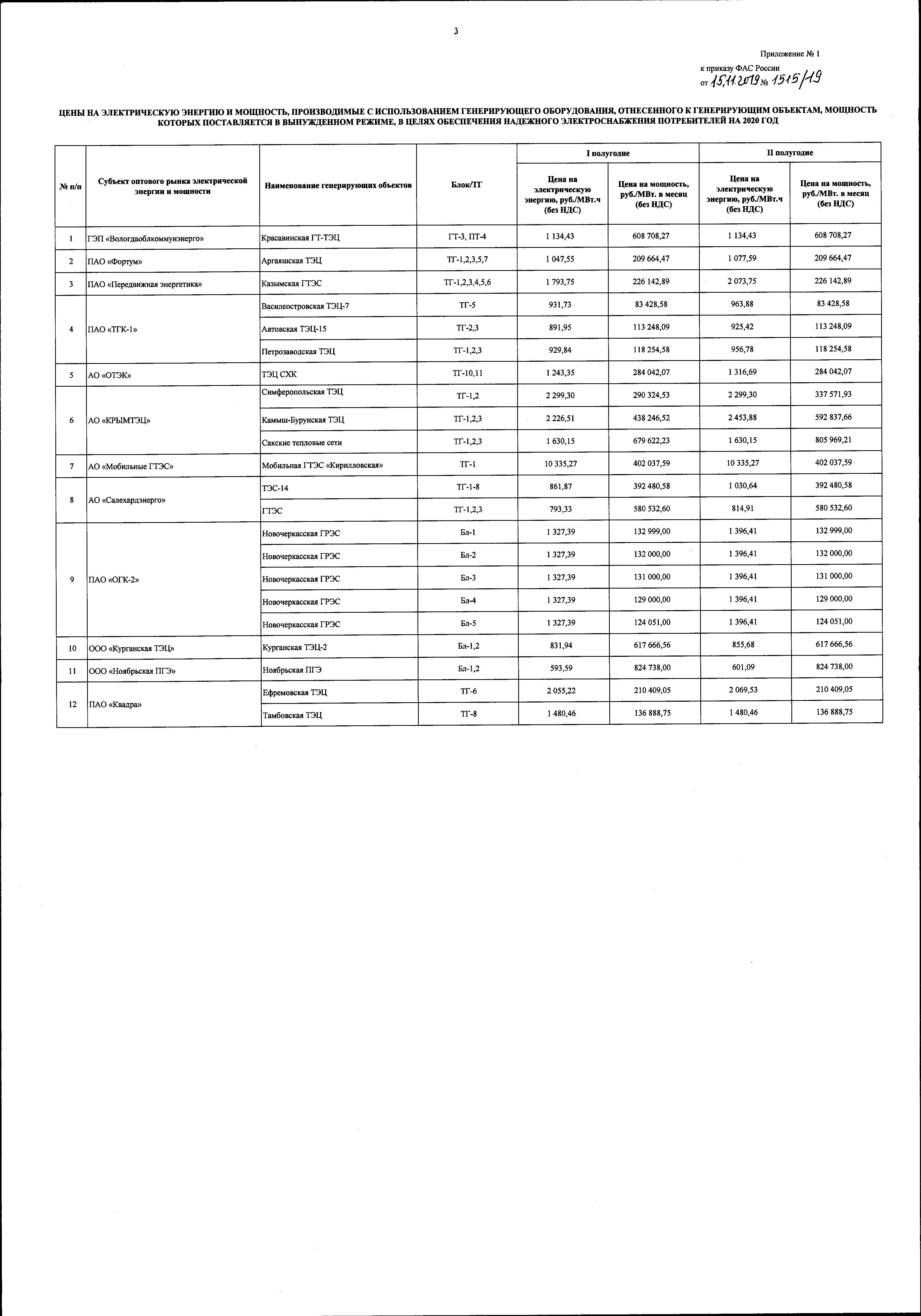 "Об утверждении цен на электрическую энергию и мощность, производимые с использованием генерирующих объектов, поставляющих мощность в вынужденном режиме, на 2020 год"