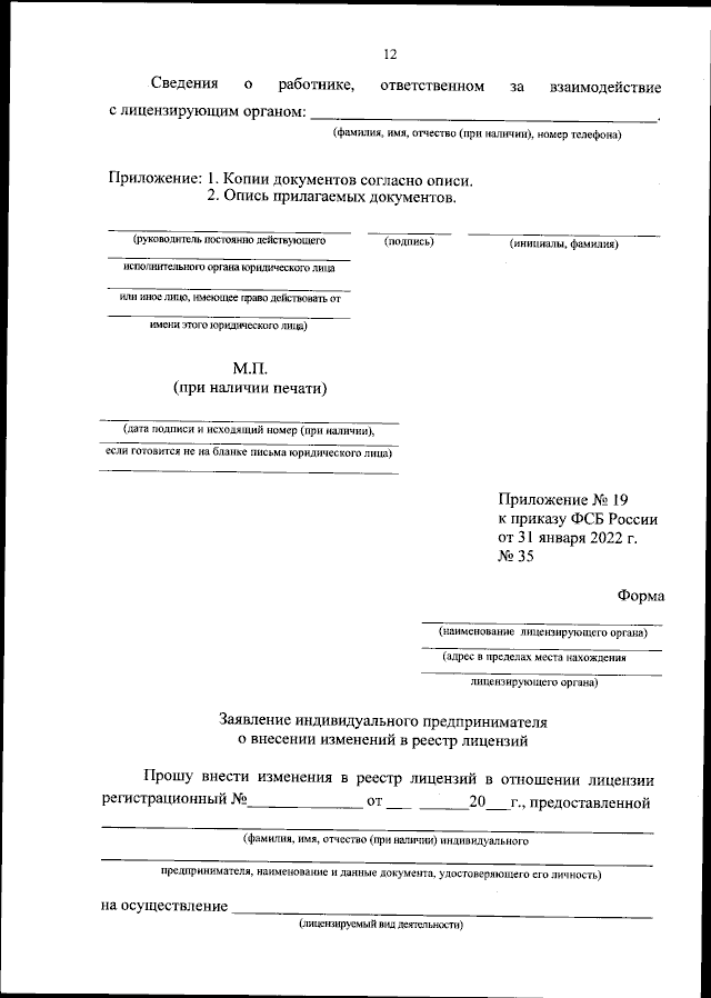 "О внесении изменений в приказ ФСБ России от 31 января 2022 г. № 35 "Об утверждении форм документов, используемых Федеральной службой безопасности Российской Федерации в процессе лицензирования в соответствии с Федеральным законом от 4 мая 2011 г. № 99-ФЗ "О лицензировании отдельных видов деятельности"