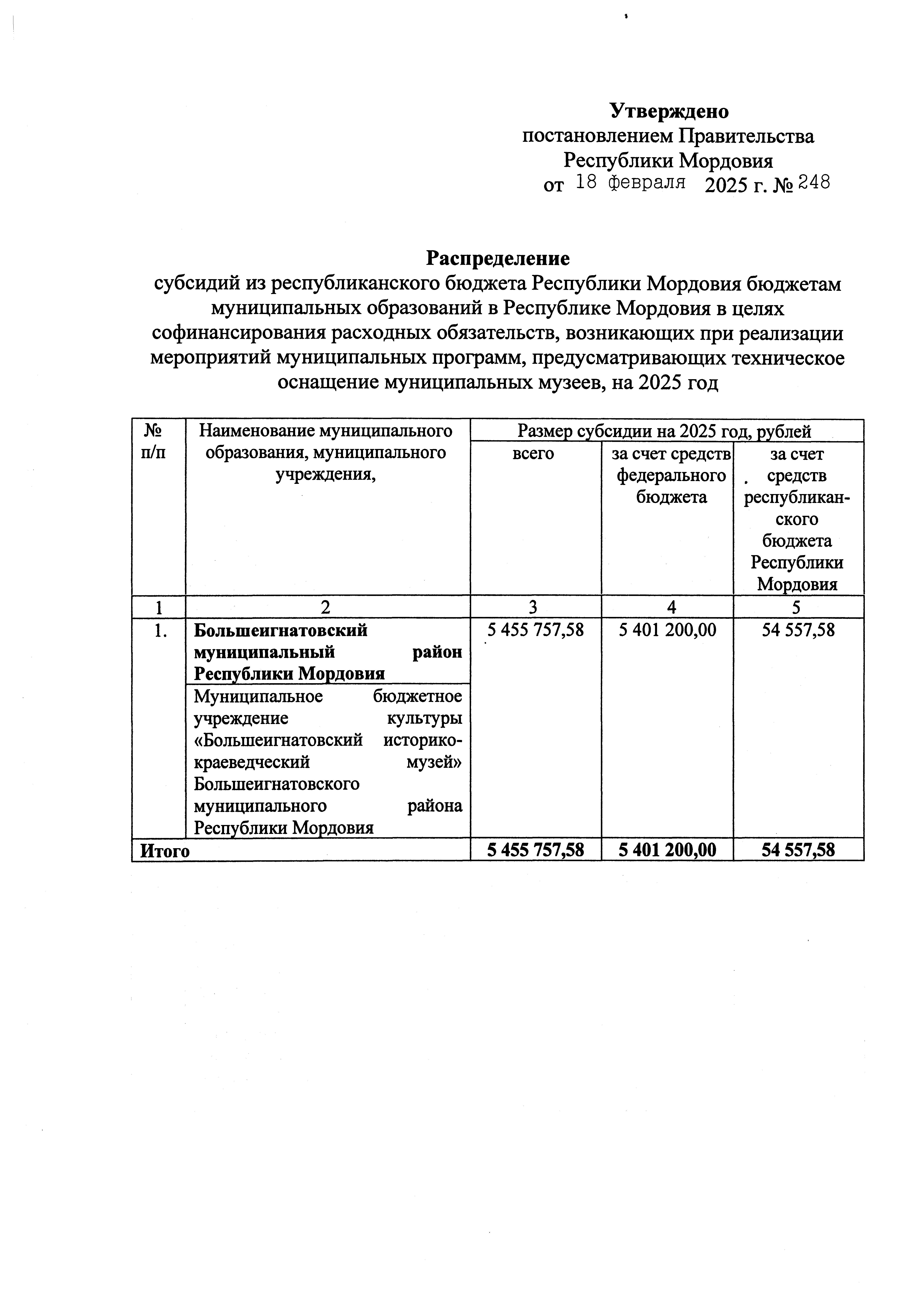Постановление Правительства Республики Мордовия от 18.02.2025 № 248