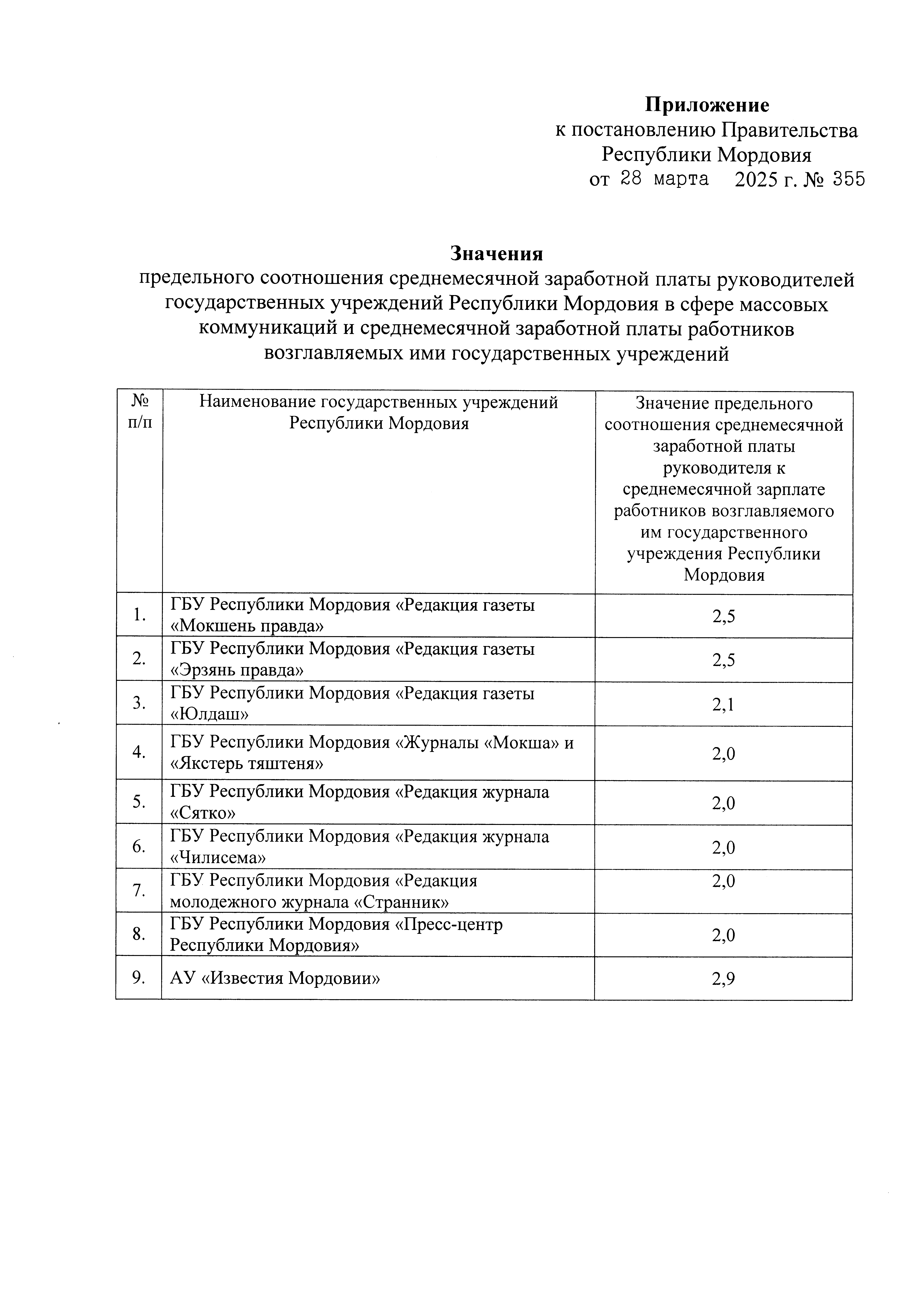 "Об установлении на 2025 год значений предельного соотношения среднемесячной заработной платы руководителей государственных учреждений Республики Мордовия в сфере массовых коммуникаций и среднемесячной заработной платы работников возглавляемых ими государственных учреждений"