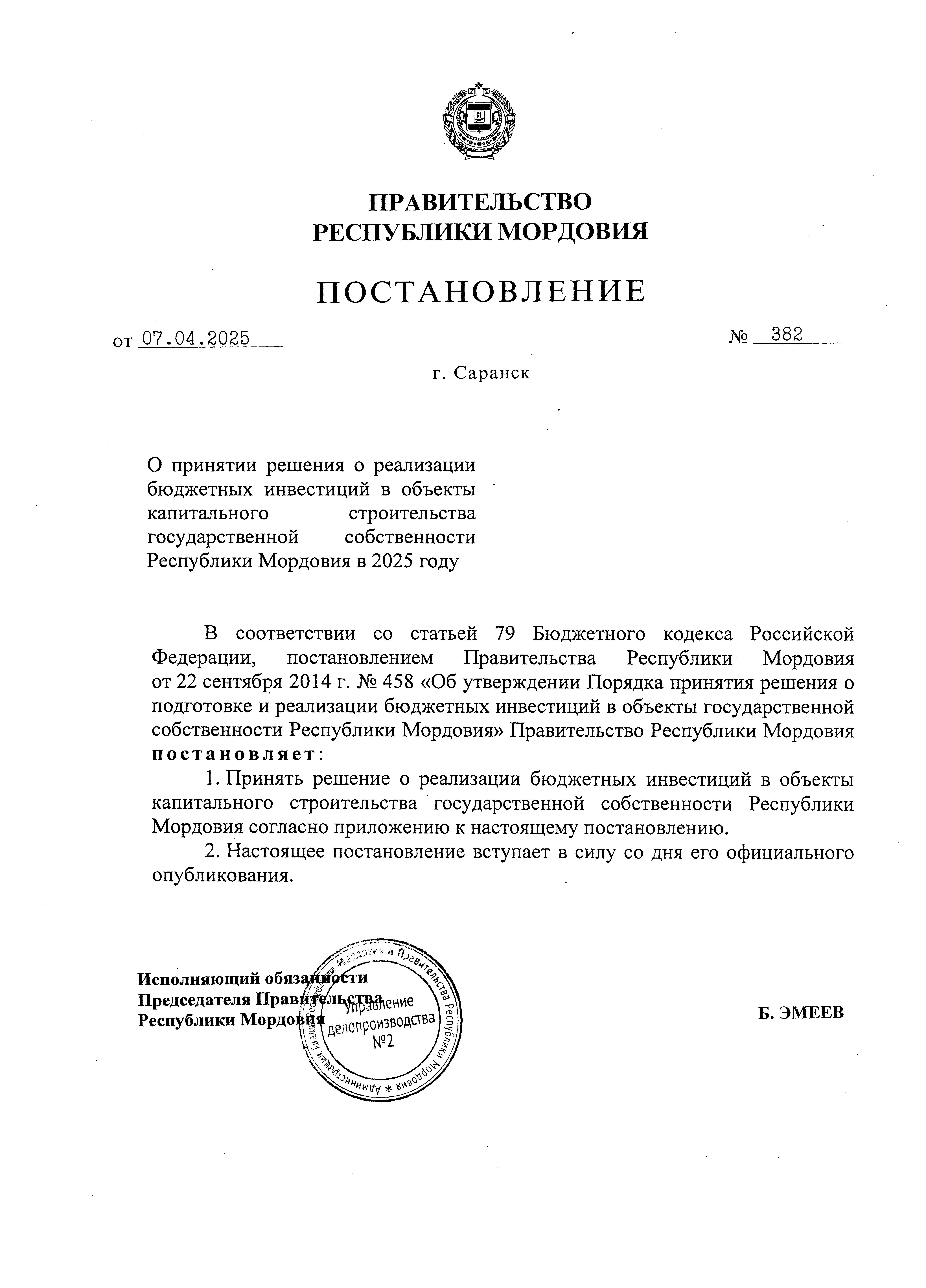 Постановление Правительства Республики Мордовия от 07.04.2025 № 382