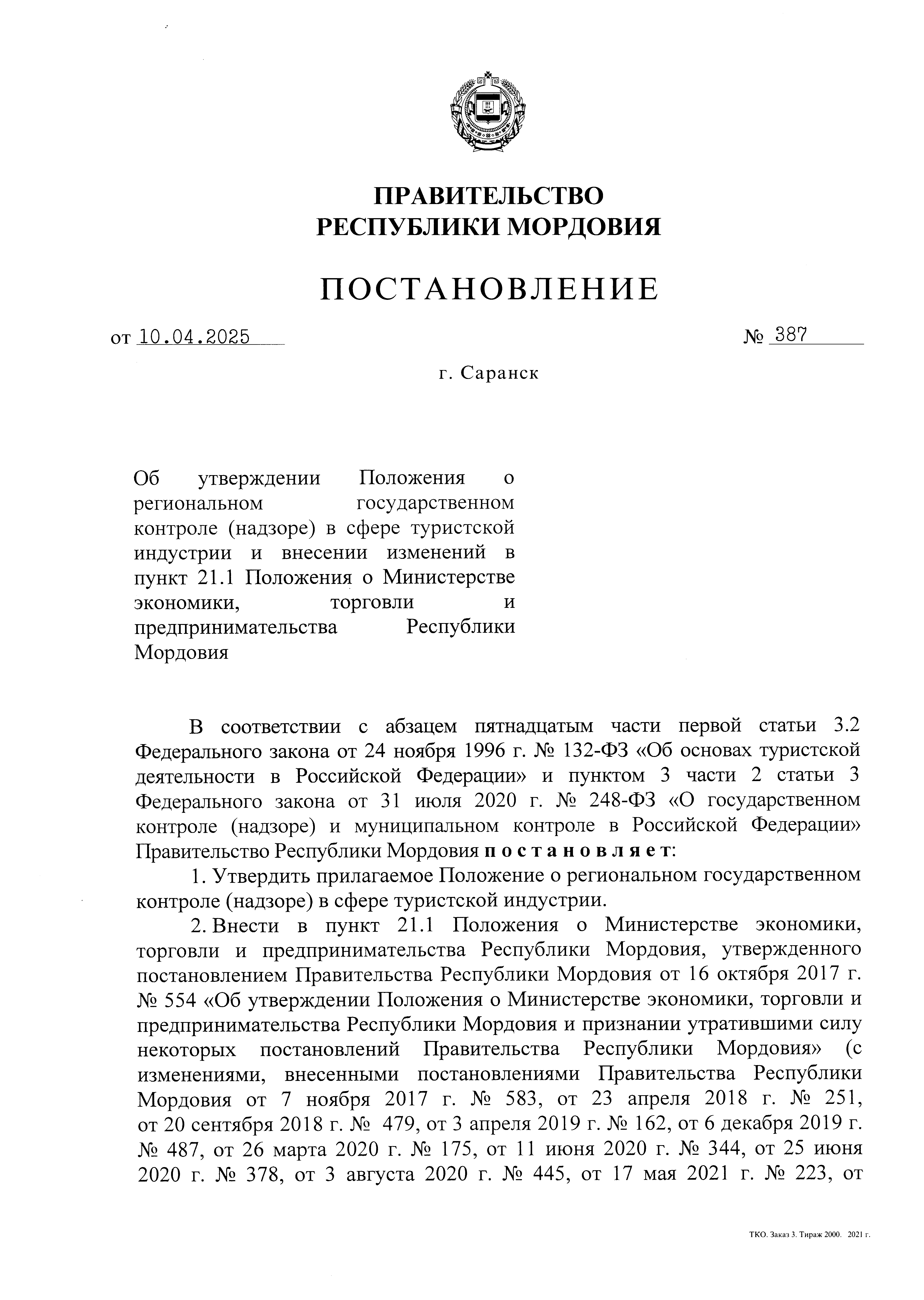 Постановление Правительства Республики Мордовия от 10.04.2025 № 387