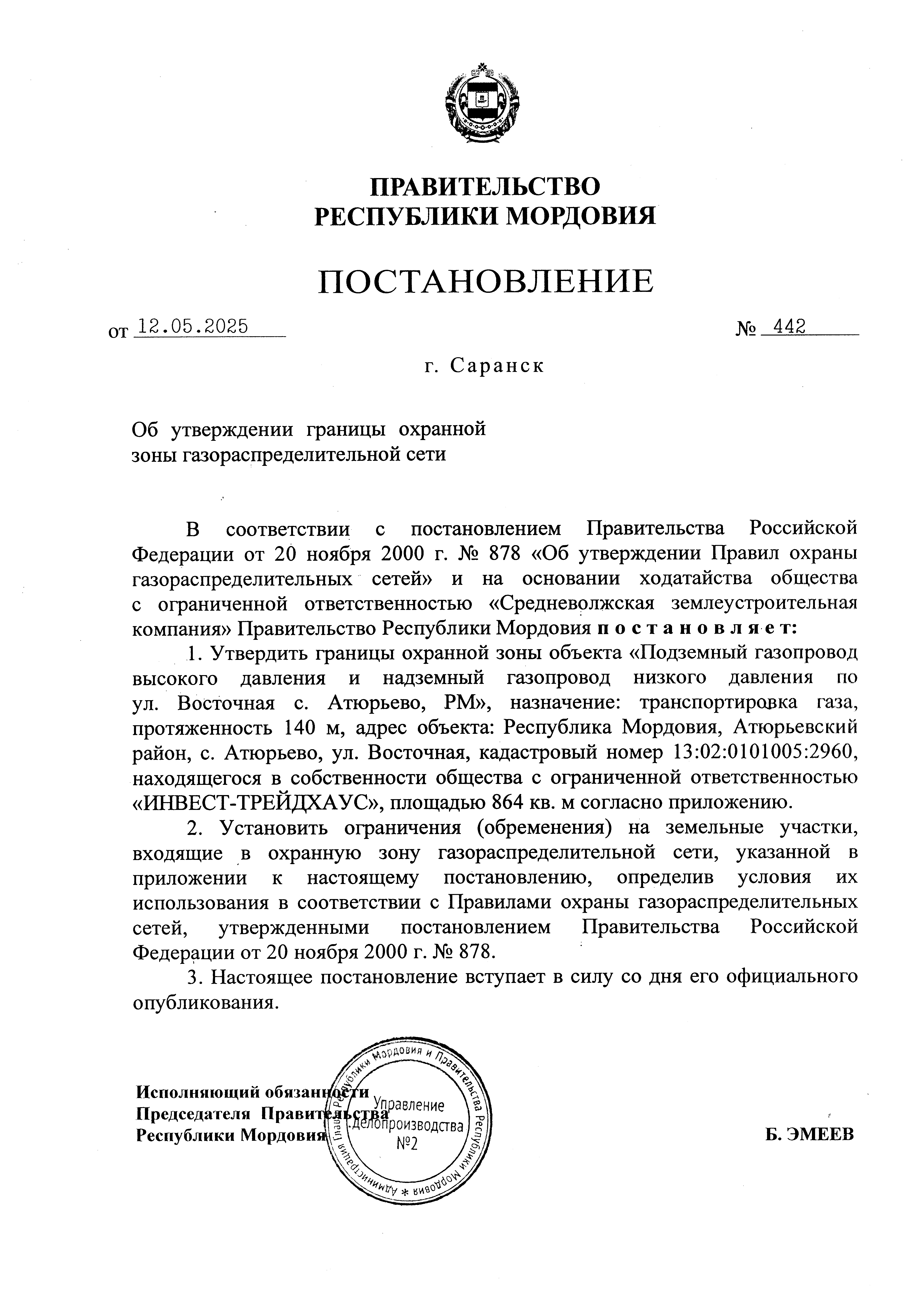 Постановление Правительства Республики Мордовия от 12.05.2025 № 442