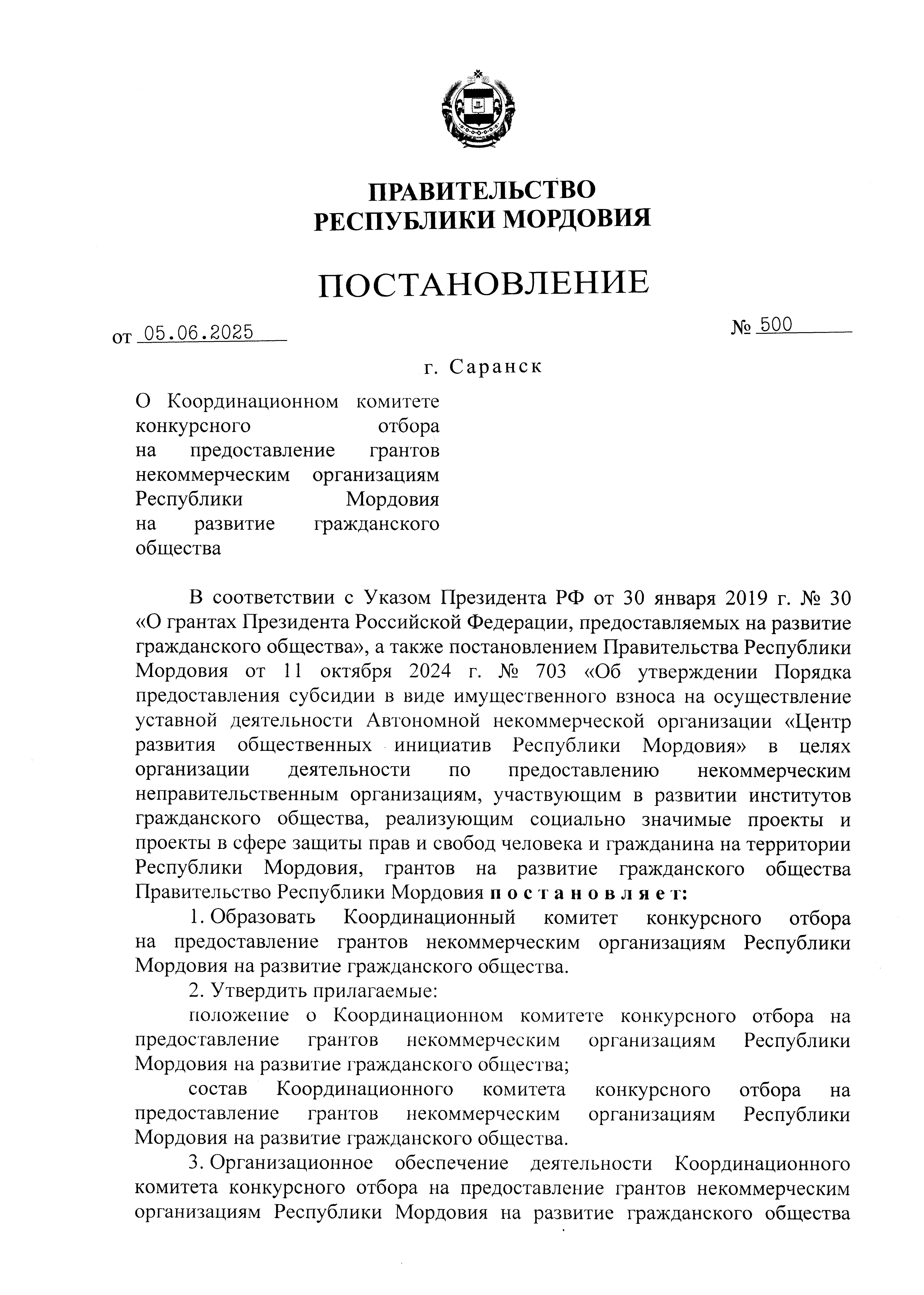 Постановление Правительства Республики Мордовия от 05.06.2025 № 500