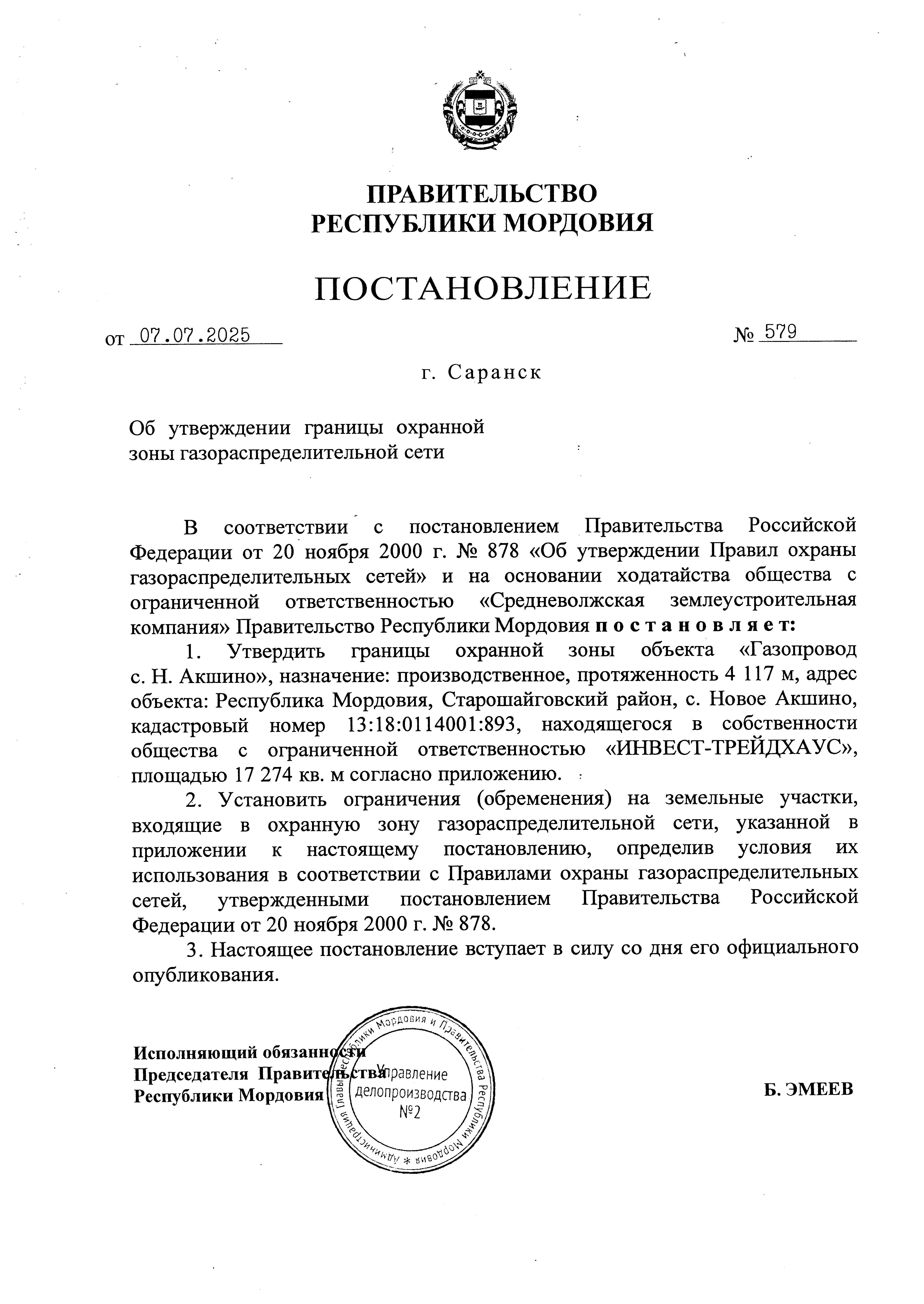 Постановление Правительства Республики Мордовия от 07.07.2025 № 579