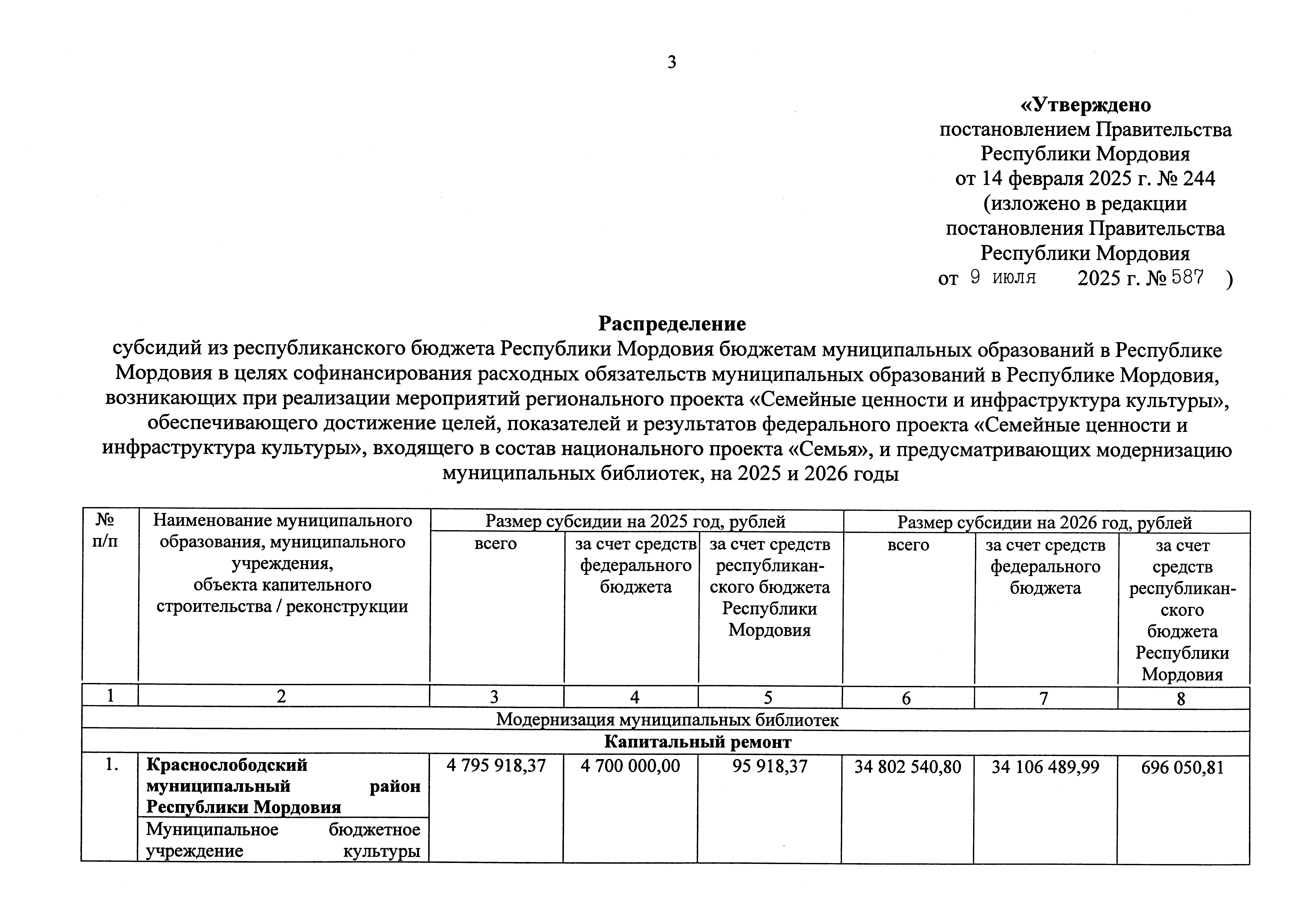 "О внесении изменения в распределение субсидий из республиканского бюджета Республики Мордовия бюджетам муниципальных образований в Республике Мордовия в целях софинансирования расходных обязательств муниципальных образований в Республике Мордовия, возникающих при реализации мероприятий регионального проекта "Семейные ценности и инфраструктура культуры", обеспечивающего достижение целей, показателей и результатов федерального проекта "Семейные ценности и инфраструктура культуры", входящего в состав национального проекта "Семья", и предусматривающих модернизацию муниципальных библиотек, на 2025 и 2026 годы"
