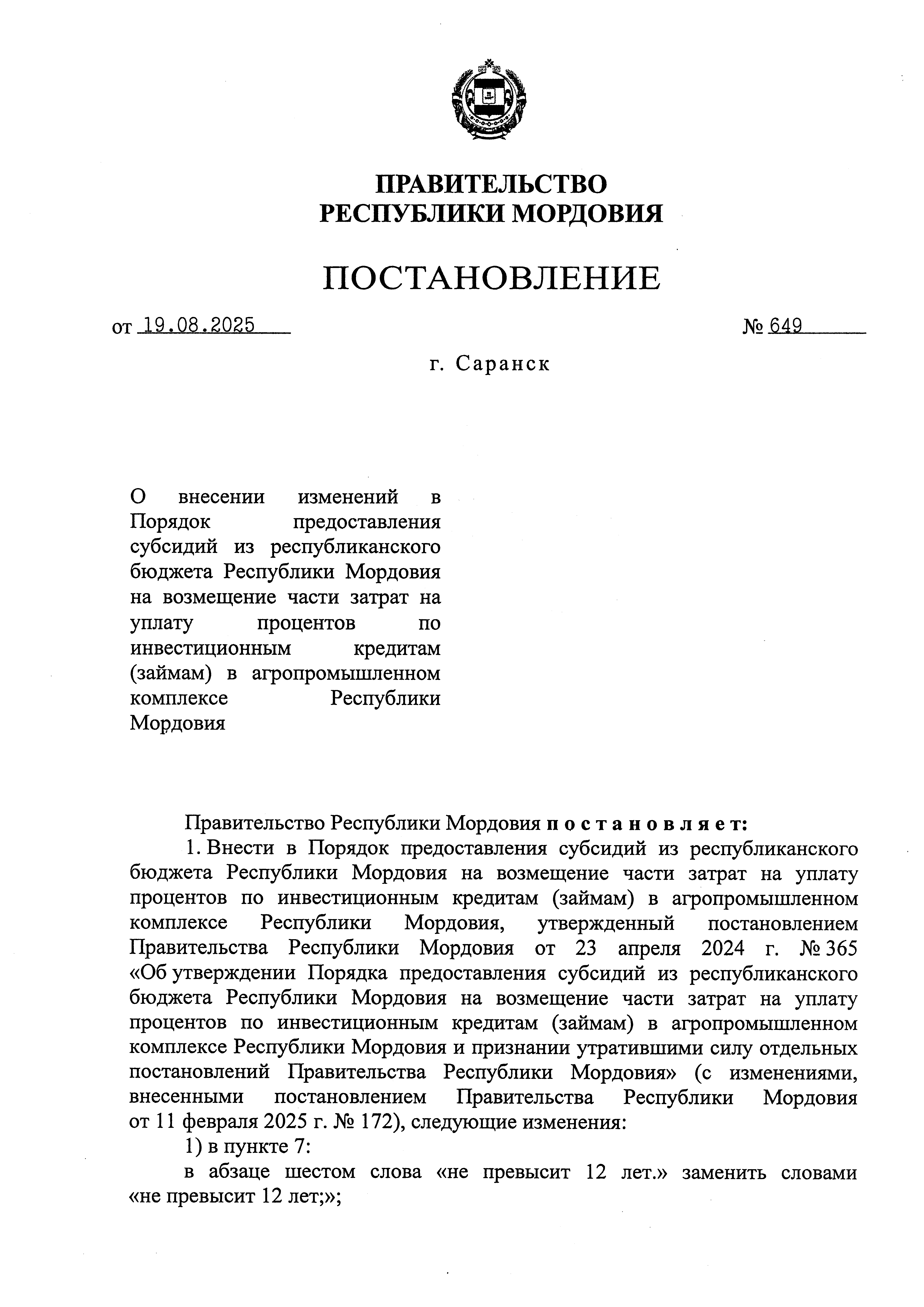 Постановление Правительства Республики Мордовия от 19.08.2025 № 649