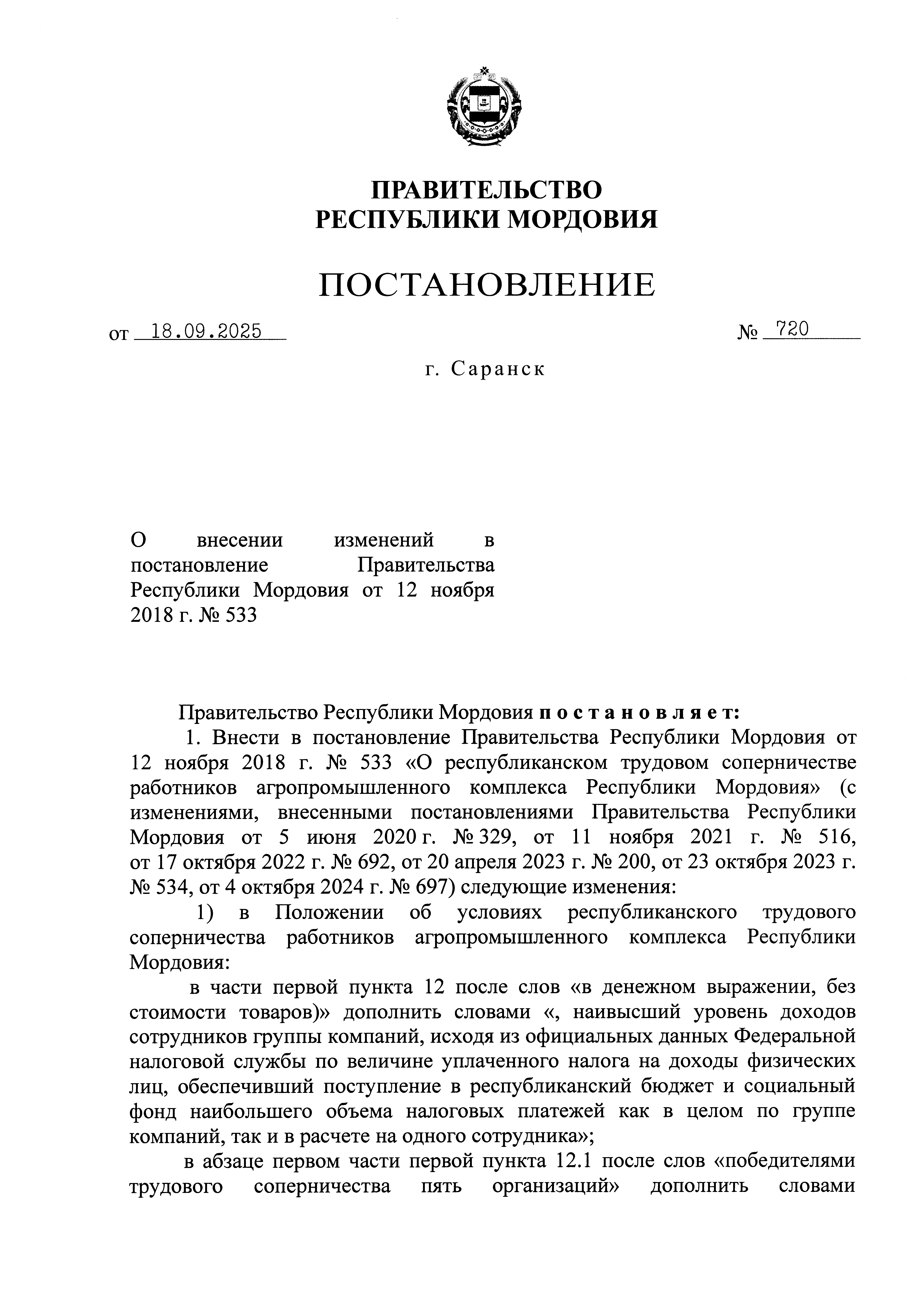 Постановление Правительства Республики Мордовия от 18.09.2025 № 720