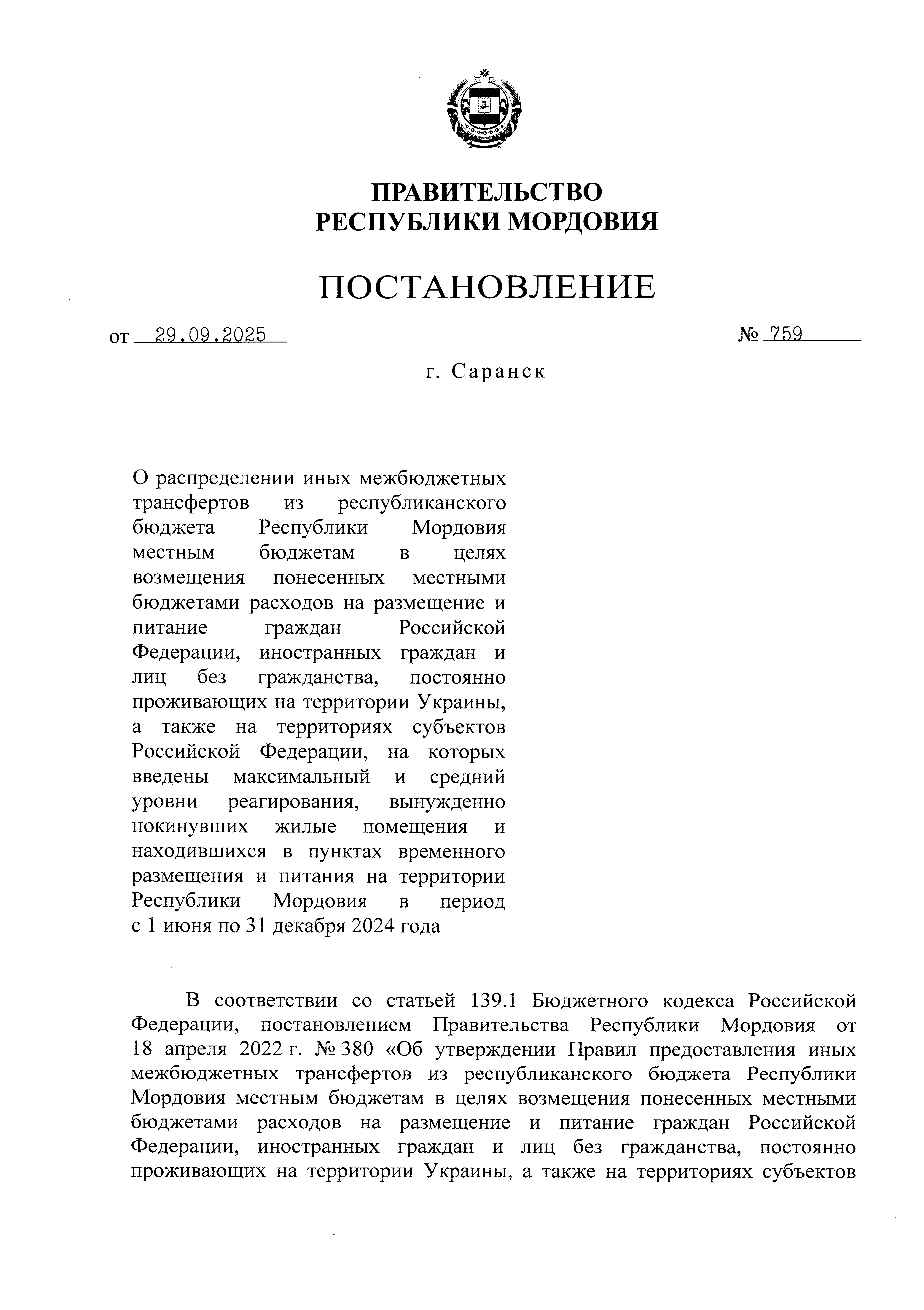 Постановление Правительства Республики Мордовия от 29.09.2025 № 759