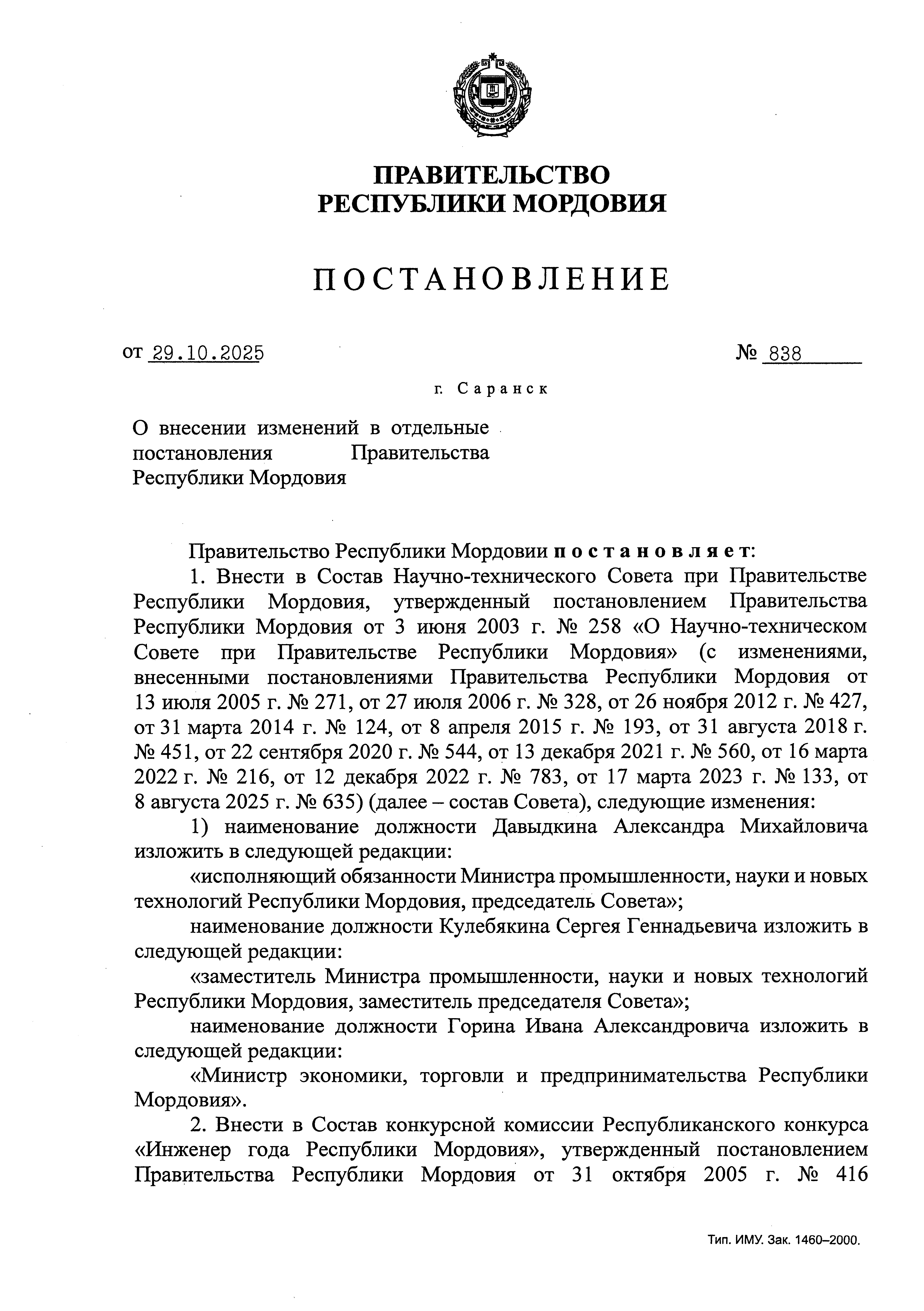 Постановление Правительства Республики Мордовия от 29.10.2025 № 838