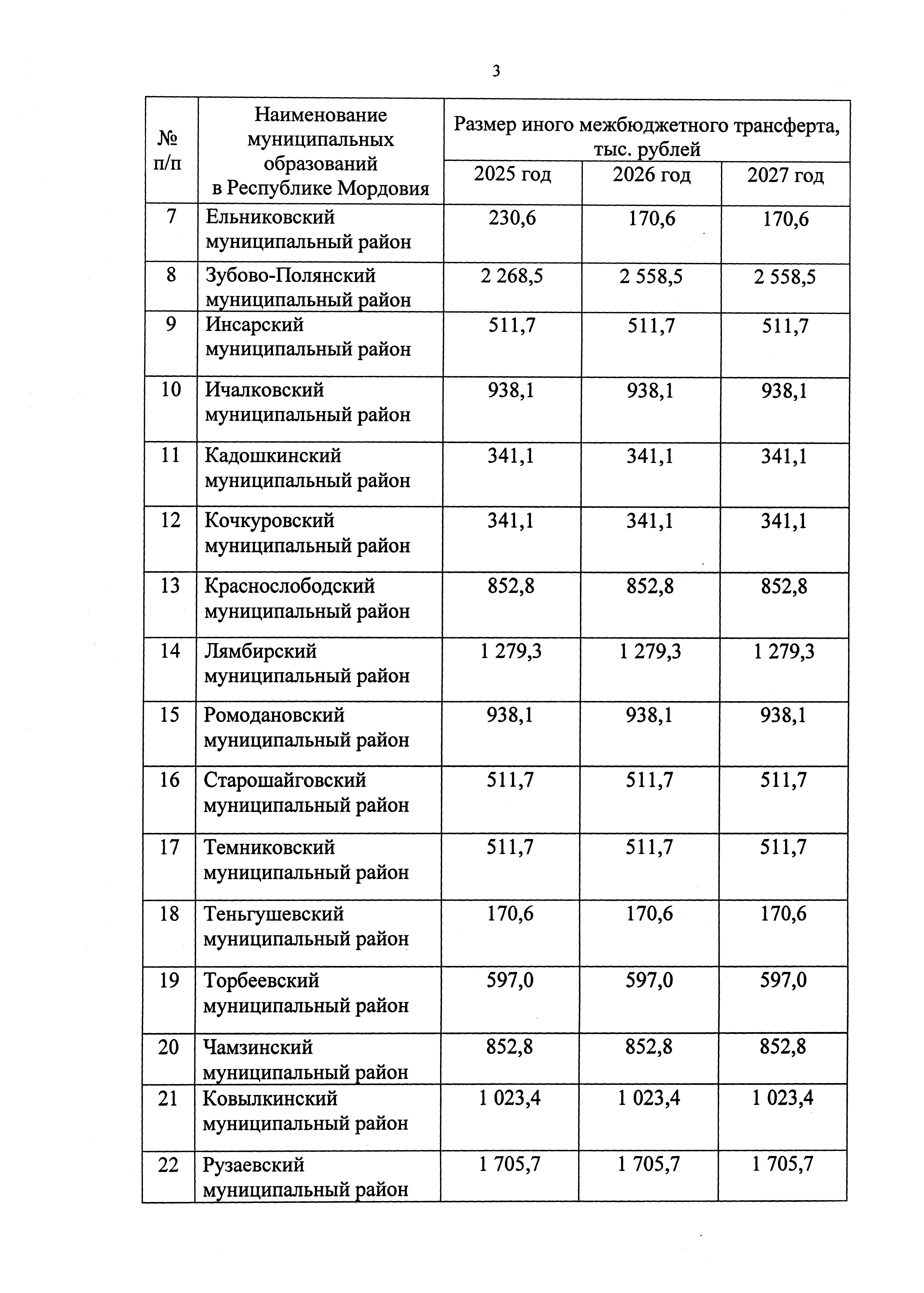 "О внесении изменения в распределение иных межбюджетных трансфертов из республиканского бюджета Республики Мордовия местным бюджетам муниципальных районов в Республике Мордовия и городского округа Саранск на ежемесячное денежное вознаграждение советникам директоров по воспитанию и взаимодействию с детскими общественными объединениями муниципальных общеобразовательных организаций на 2025 год и плановый период 2026 и 2027 годов"
