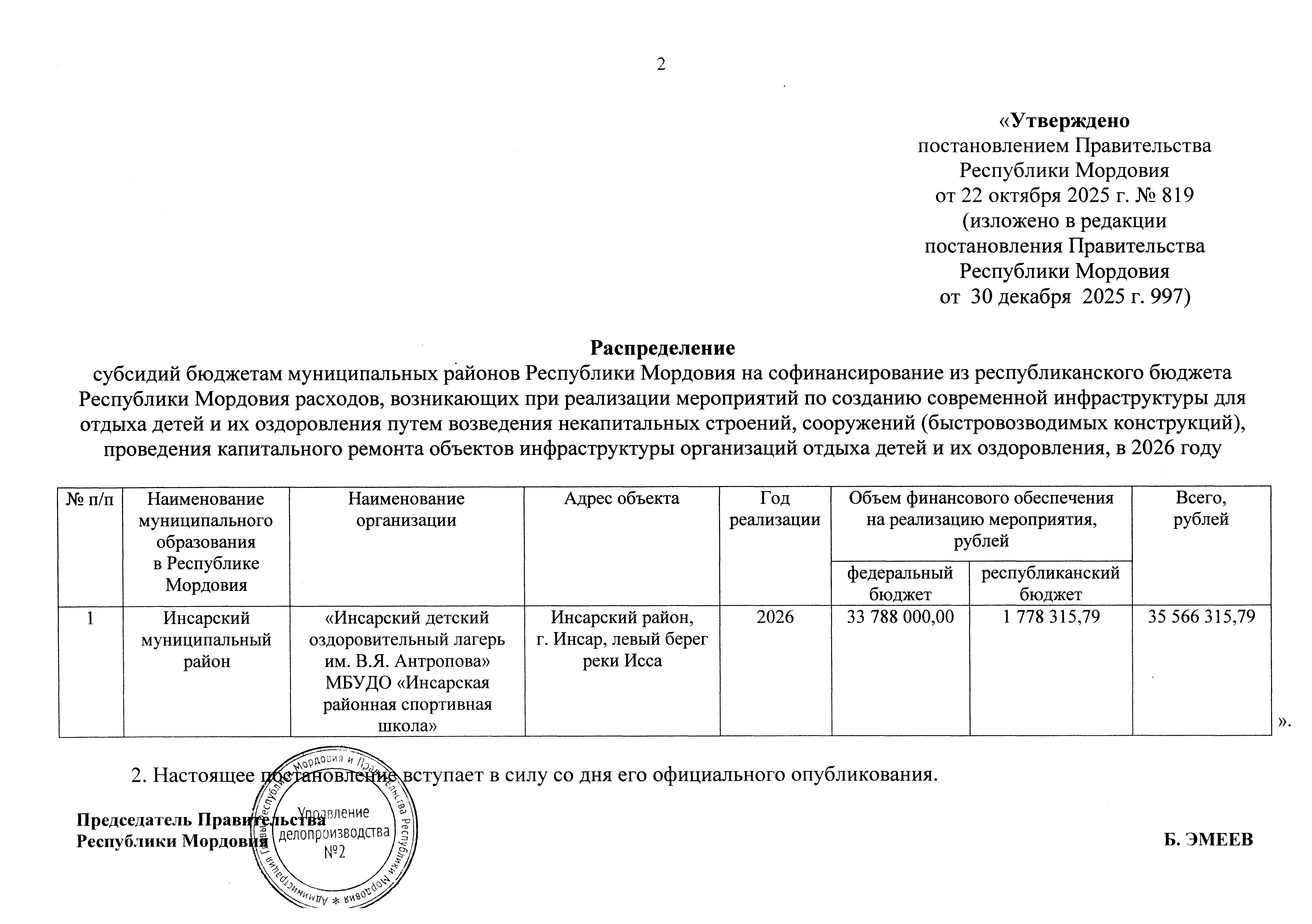 Постановление Правительства Республики Мордовия от 30.12.2025 № 997