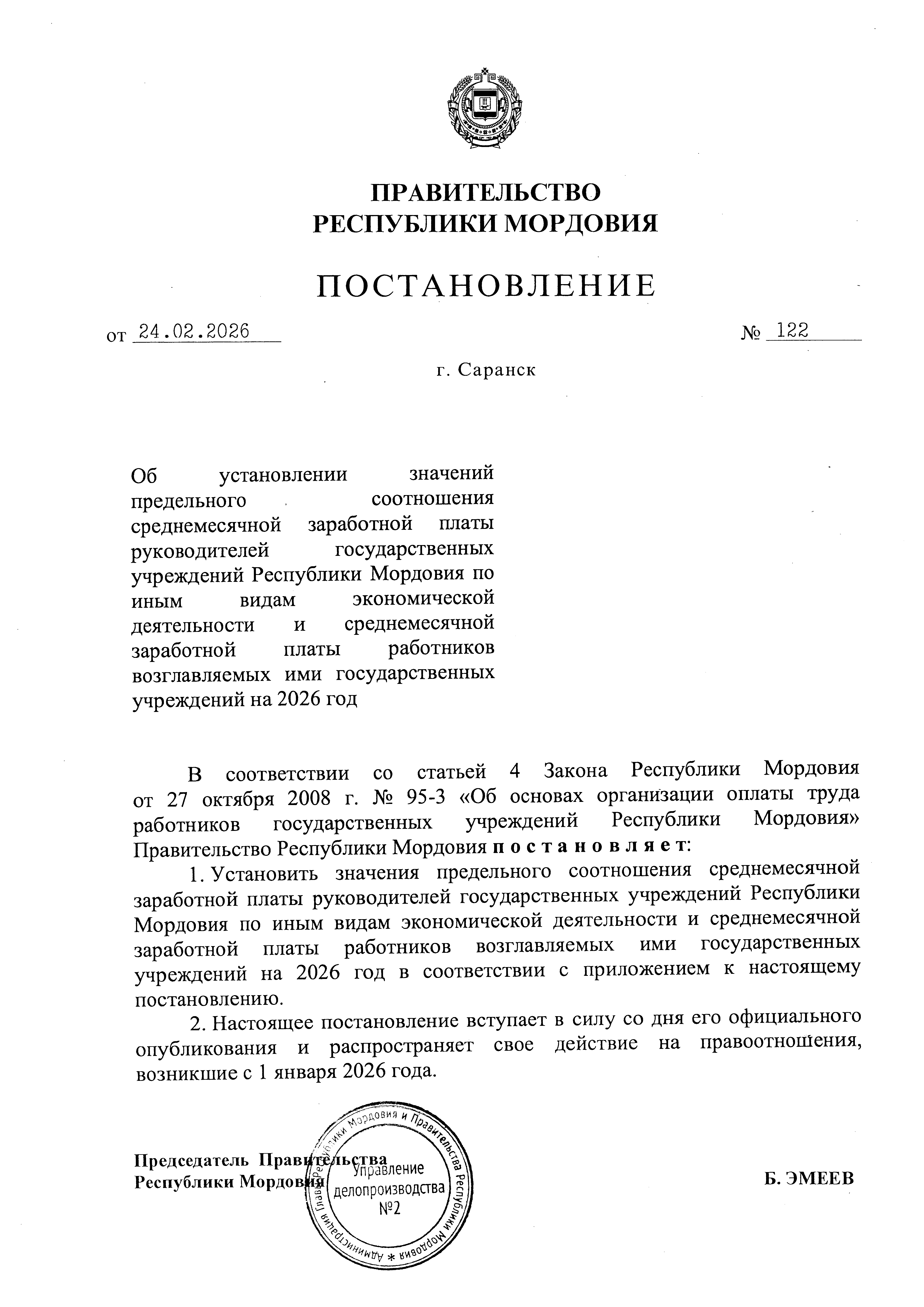 Постановление Правительства Республики Мордовия от 24.02.2026 № 122