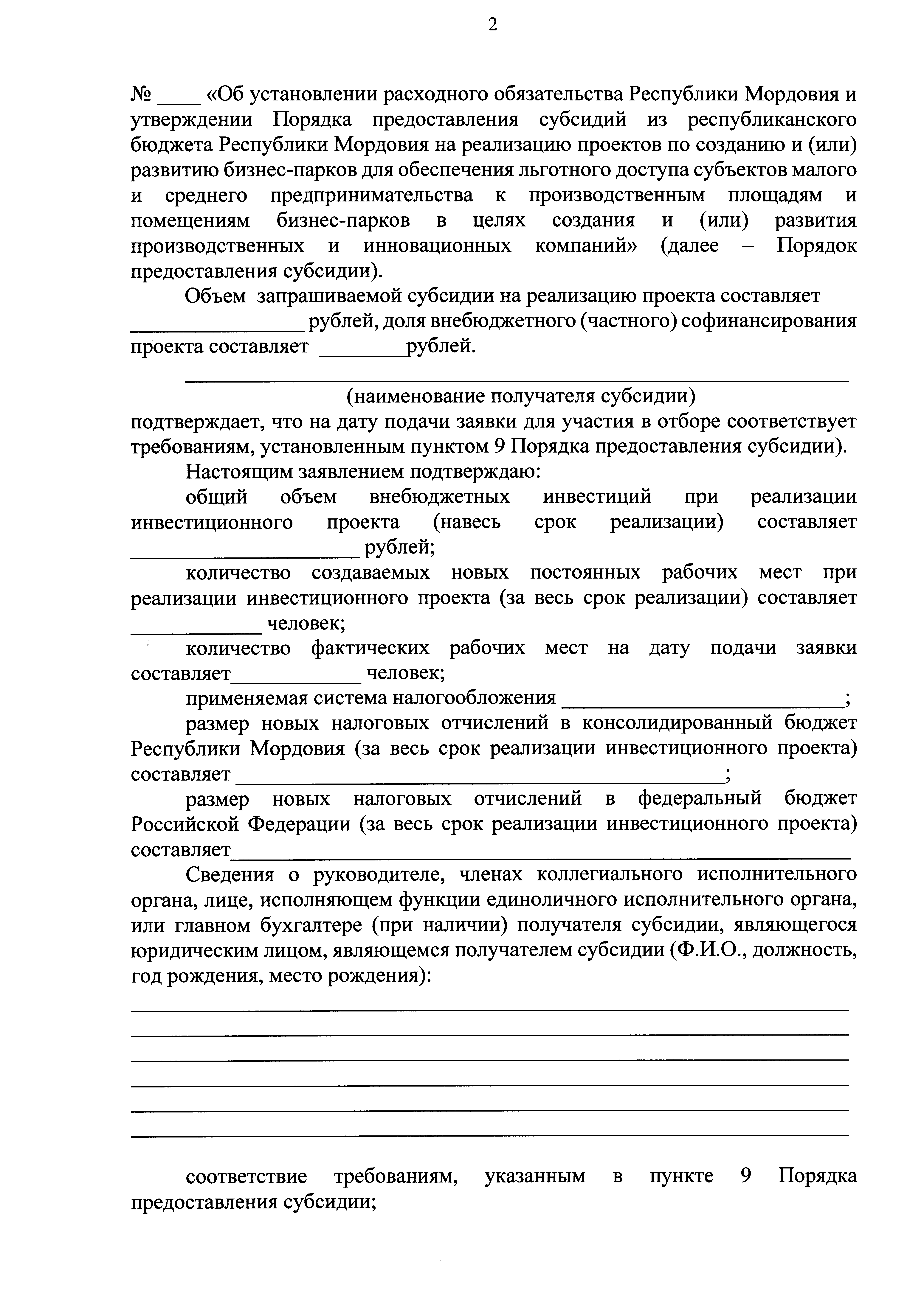 "Об установлении расходного обязательства Республики Мордовия и утверждении Порядка предоставления субсидий из республиканского бюджета Республики Мордовия на реализацию проектов по созданию и (или) развитию бизнес-парков для обеспечения льготного доступа субъектов малого и среднего предпринимательства к производственным площадям и помещениям бизнес-парков в целях создания и (или) развития производственных и инновационых компаний"