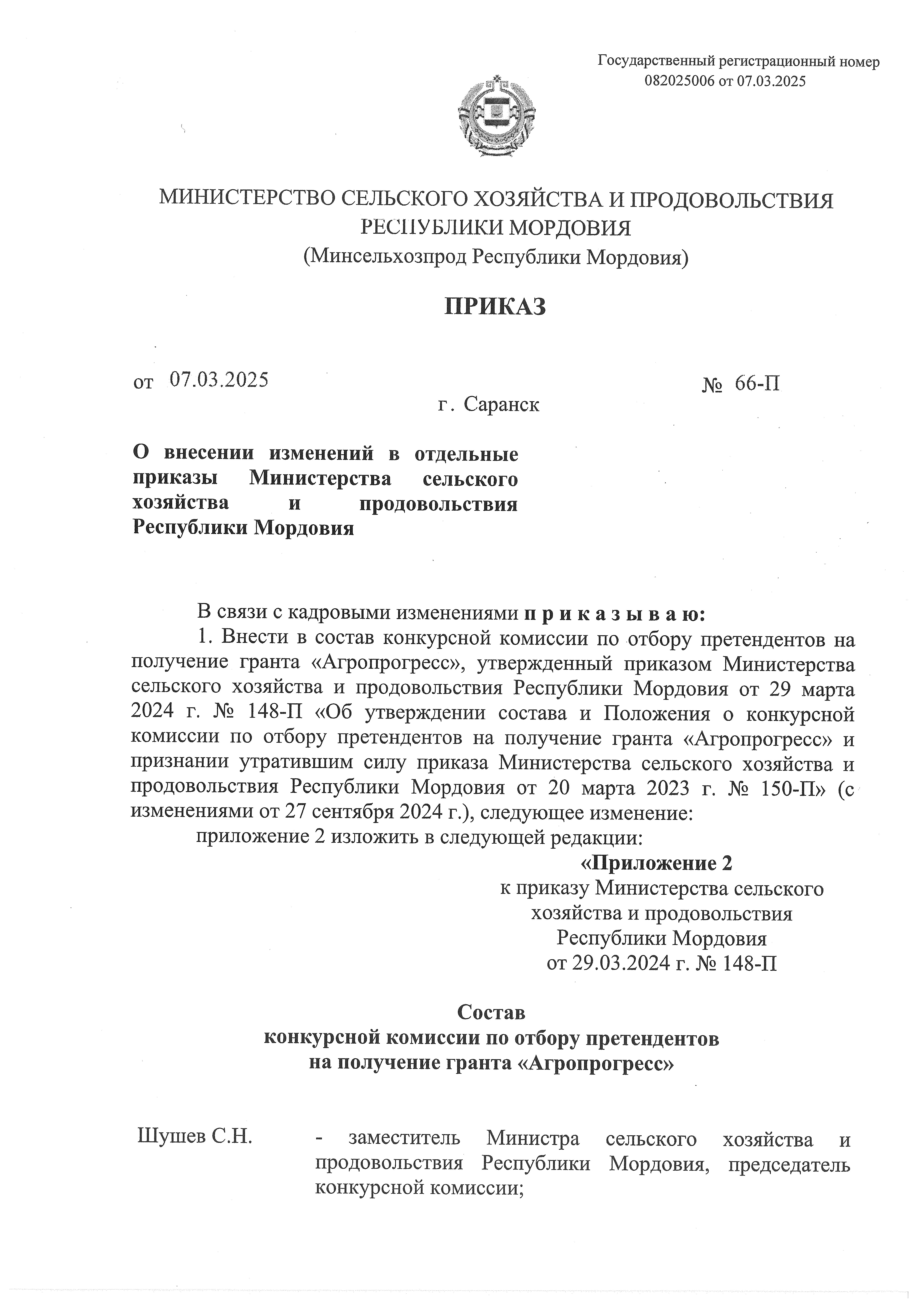 Приказ Министерства сельского хозяйства и продовольствия Республики Мордовия от 07.03.2025 № 66-П