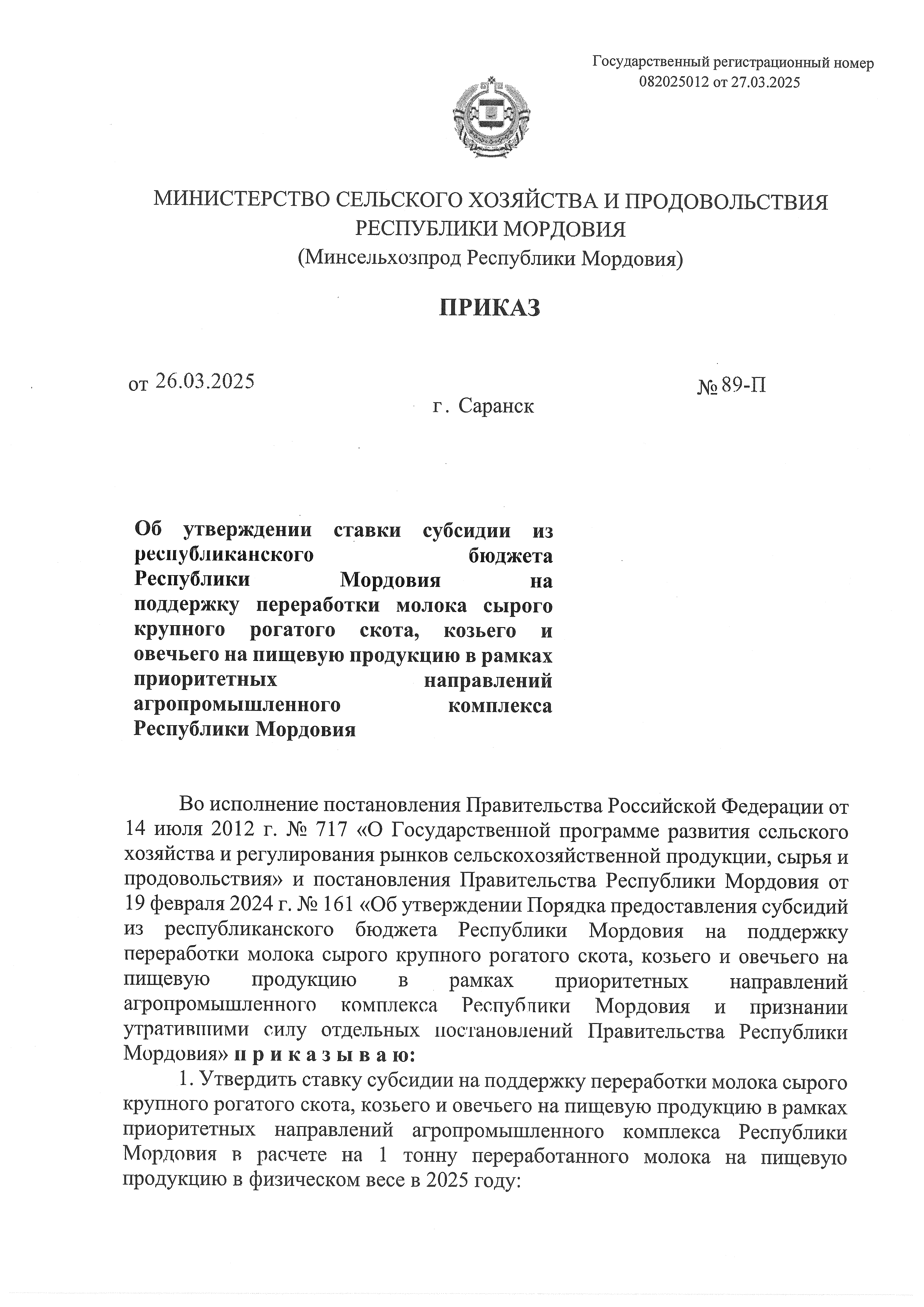 Приказ Министерства сельского хозяйства и продовольствия Республики Мордовия от 26.03.2025 № 89-П