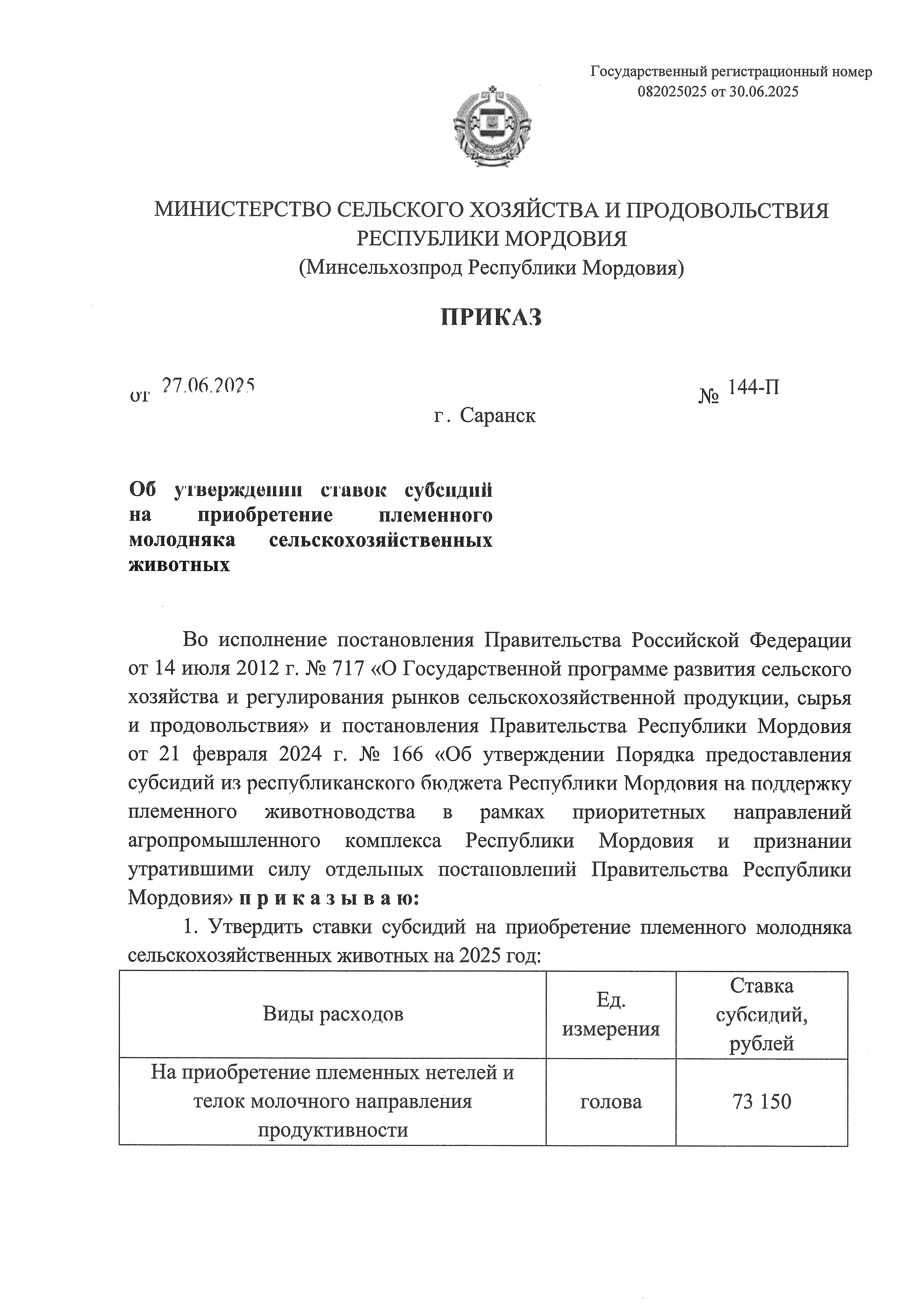 Приказ Министерства сельского хозяйства и продовольствия Республики Мордовия от 27.06.2025 № 144-П