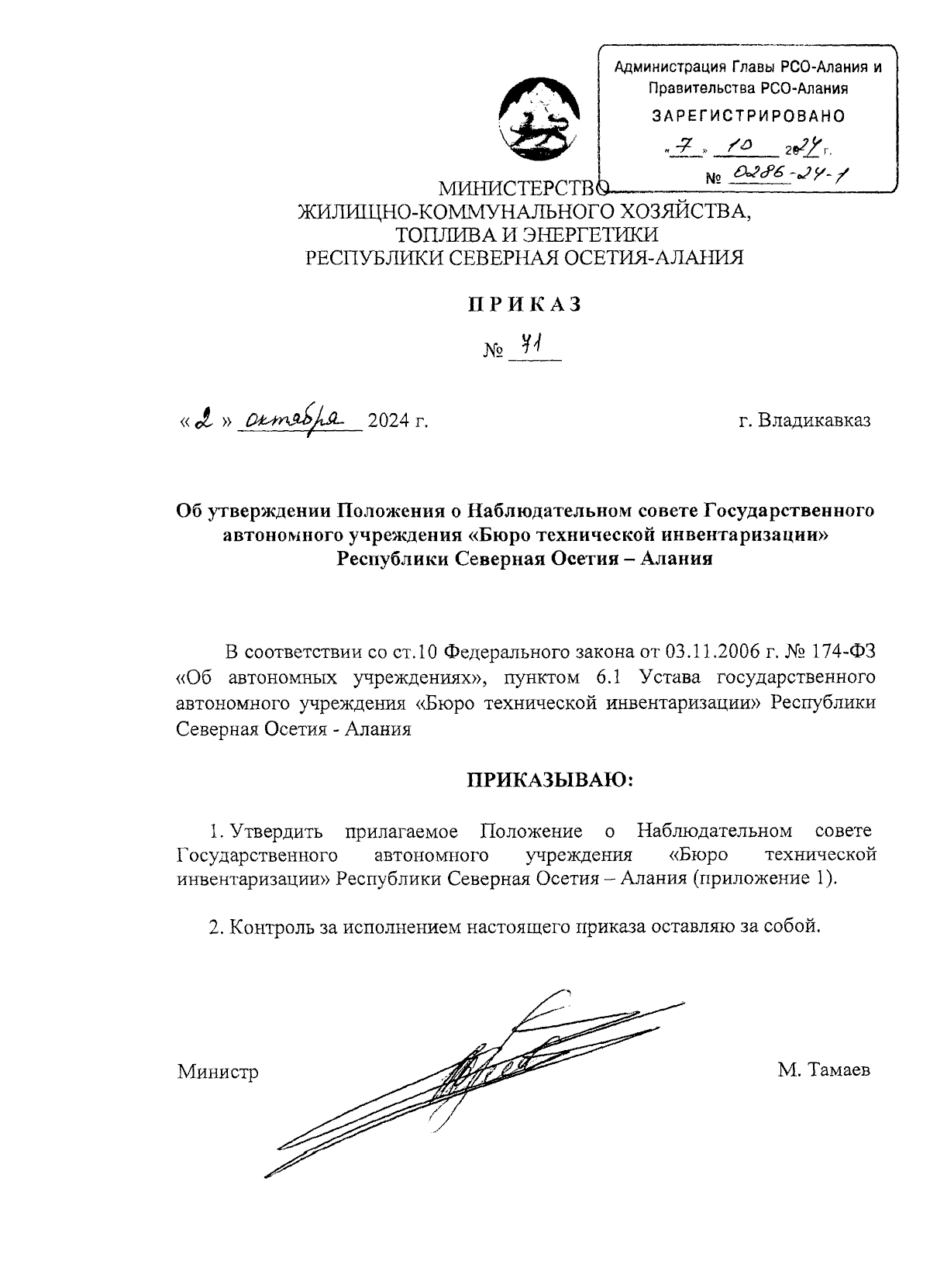 Приказ Министерства жилищно-коммунального хозяйства, топлива и энергетики Республики Северная Осетия-Алания от 02.10.2024 № 71