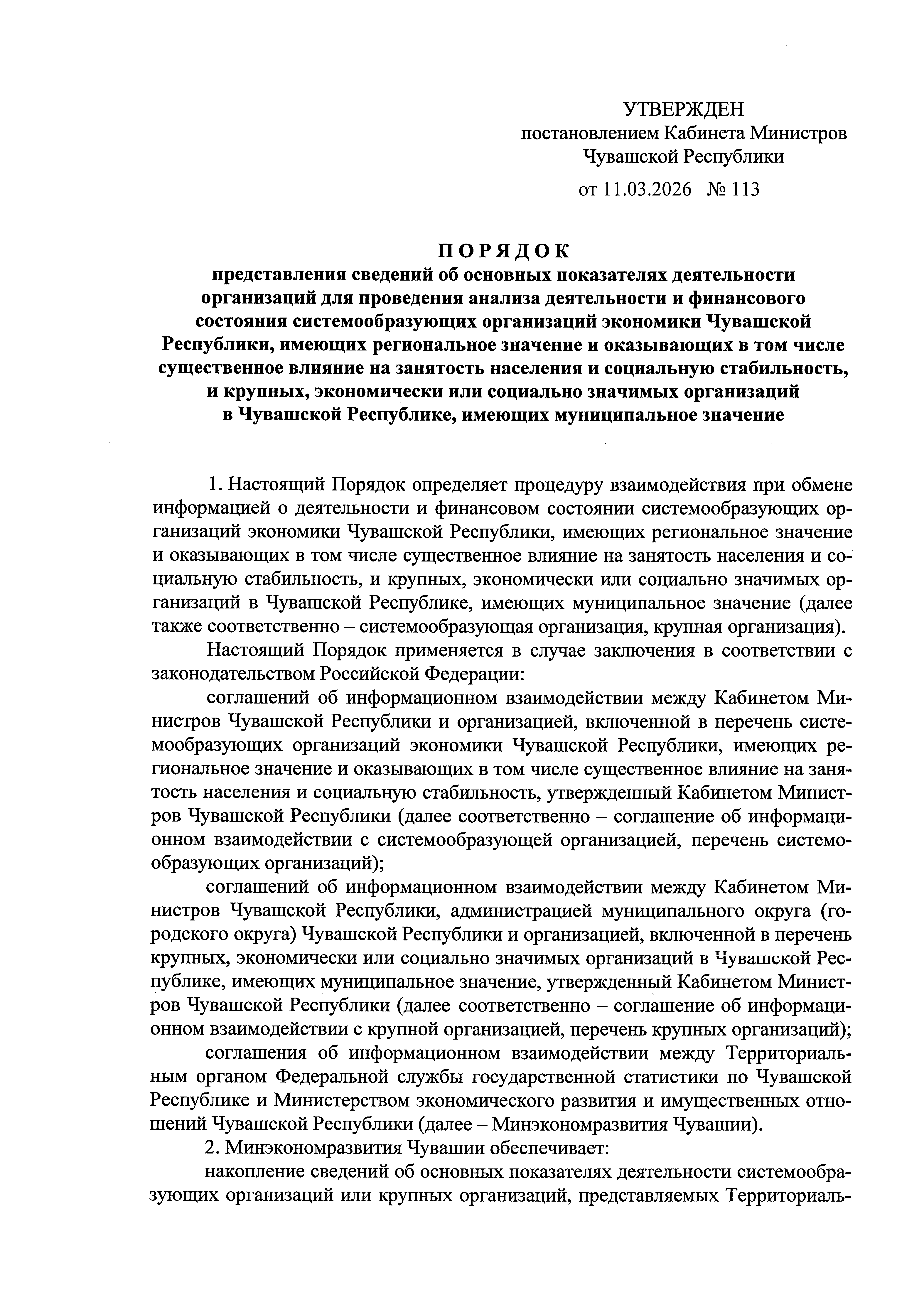 Постановление Кабинета Министров Чувашской Республики от 11.03.2026 № 113