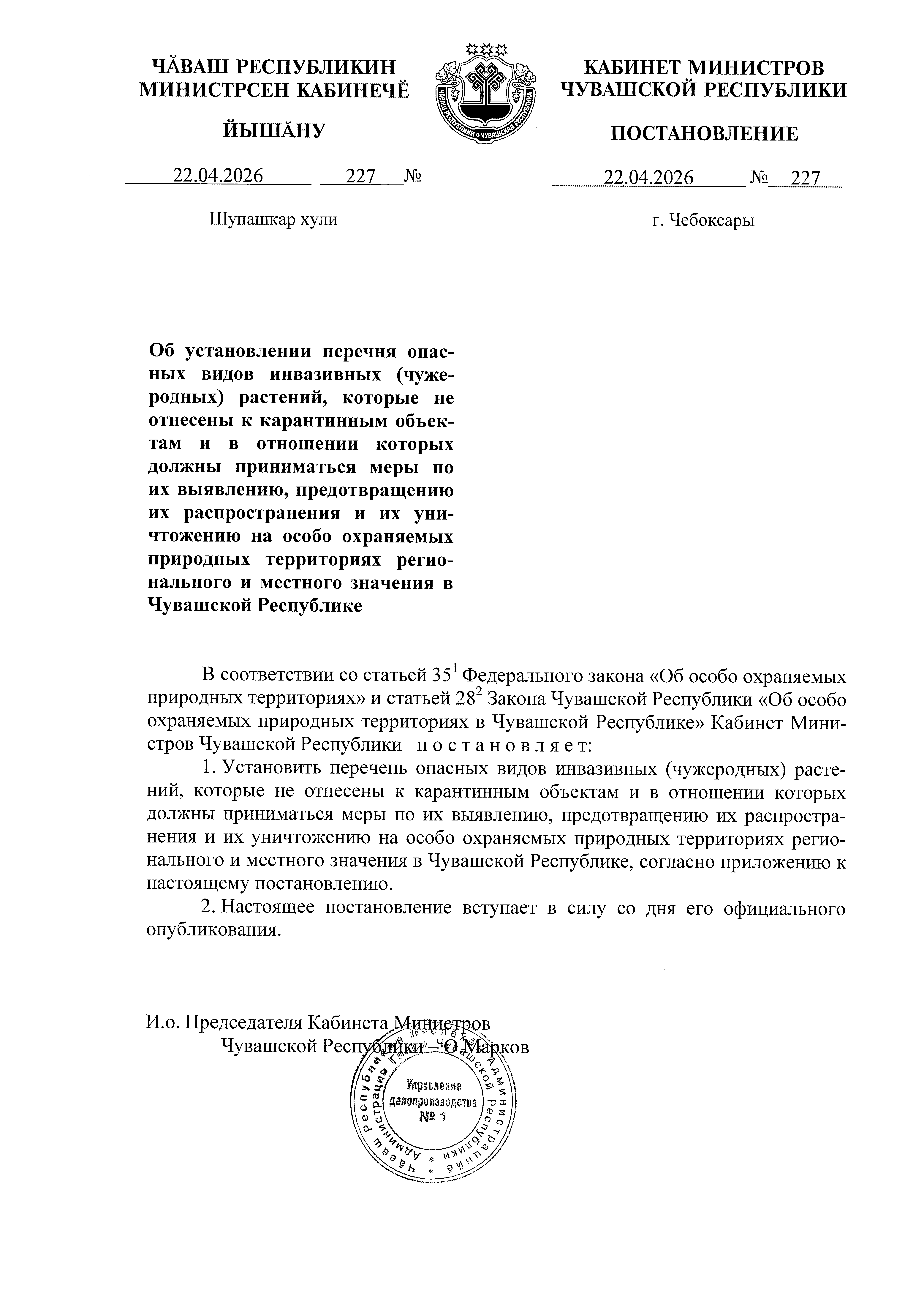 Постановление Кабинета Министров Чувашской Республики от 22.04.2026 № 227