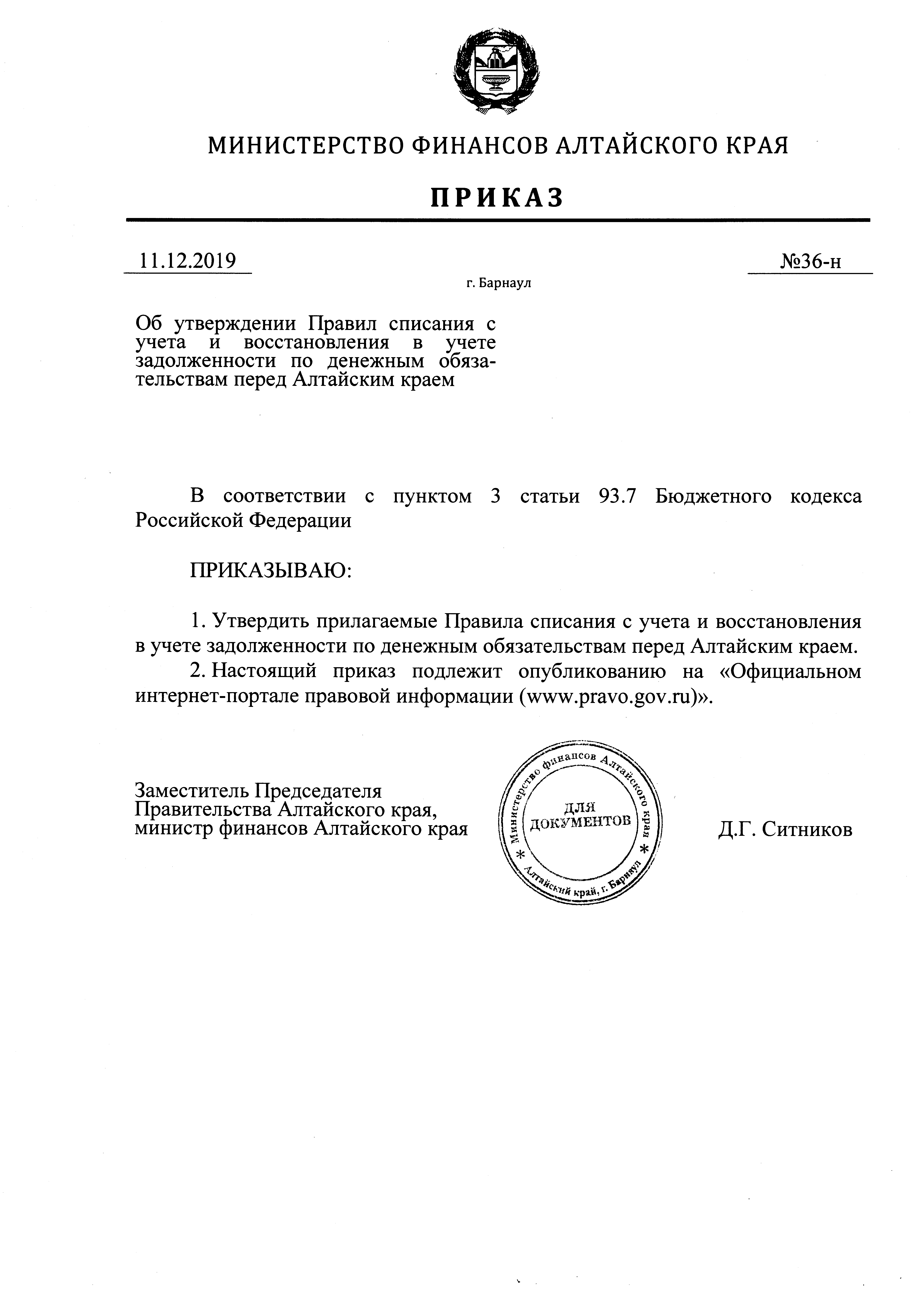 Приказ Министерства финансов Алтайского края от 11.12.2019 № 36-н