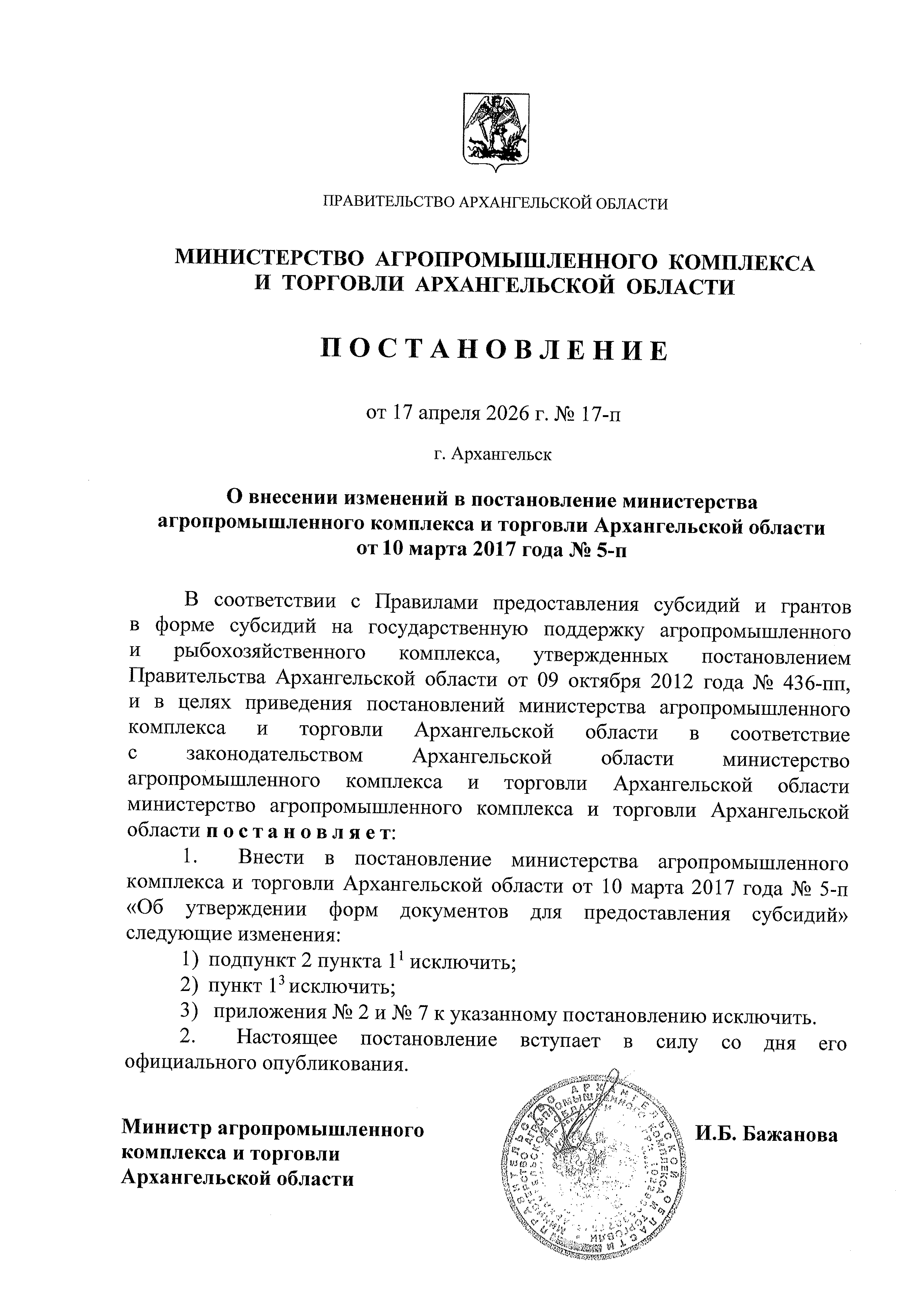 Постановление Министерства агропромышленного комплекса и торговли Архангельской области от 17.04.2026 № 17-п