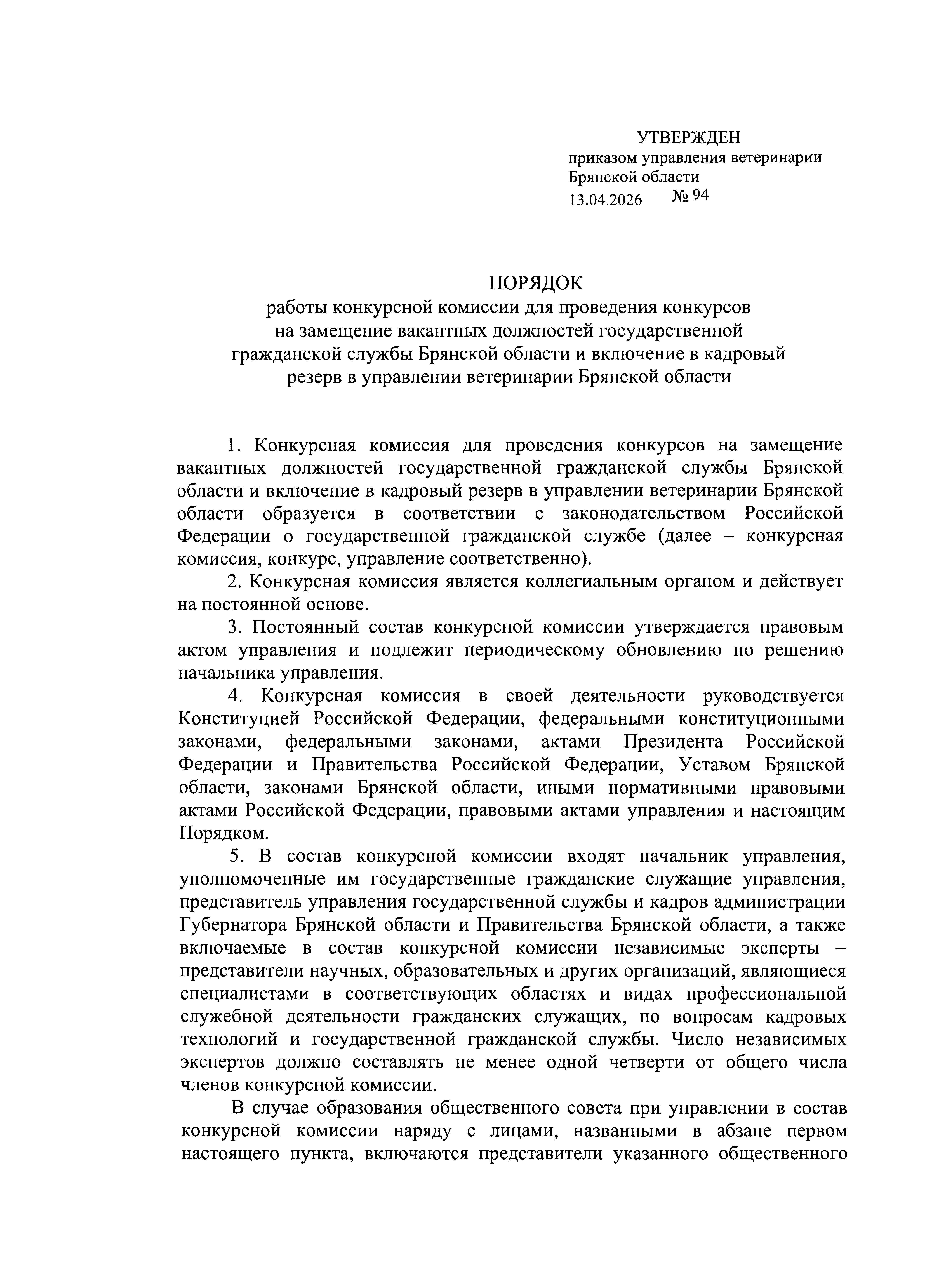 Приказ Управления ветеринарии Брянской области от 13.04.2026 № 94