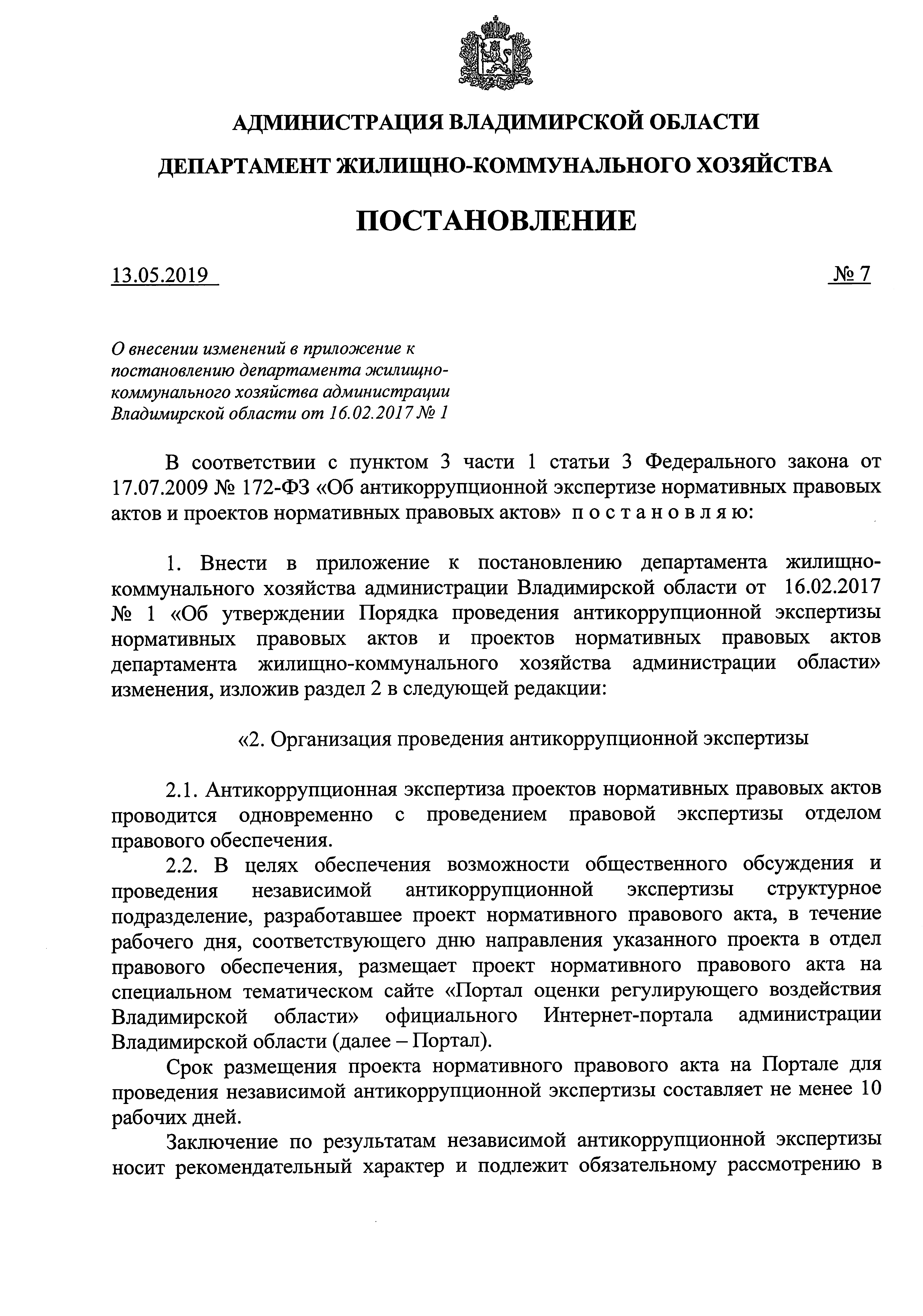 Постановление Департамента жилищно-коммунального хозяйства Владимирской области от 13.05.2019 № 7