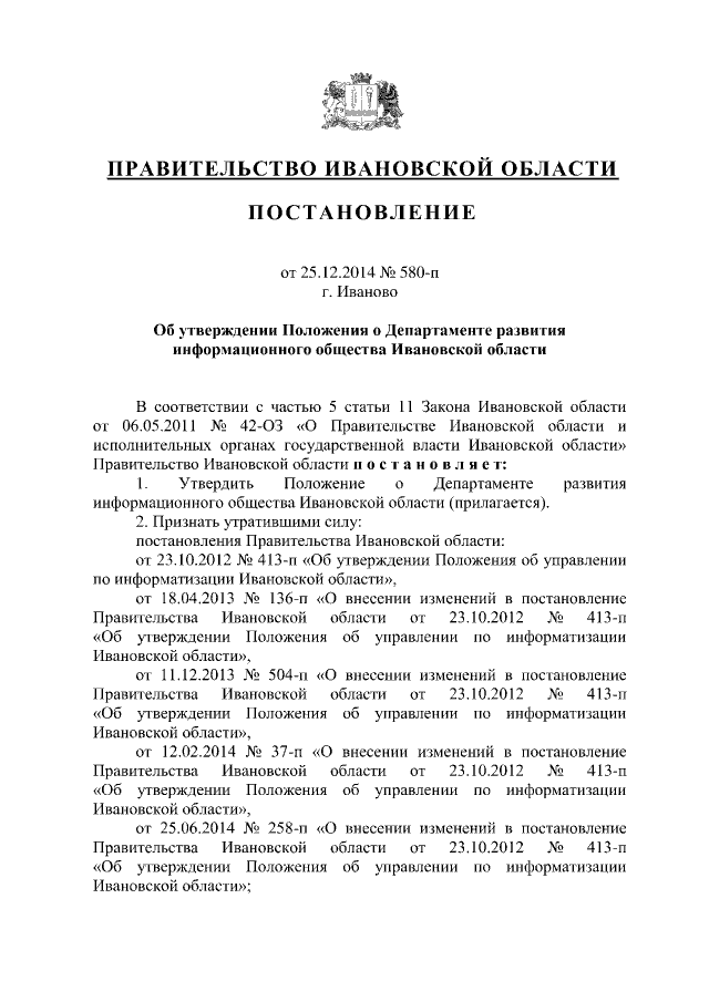 Постановление Правительства Ивановской области от 25.12.2014 № 580-п