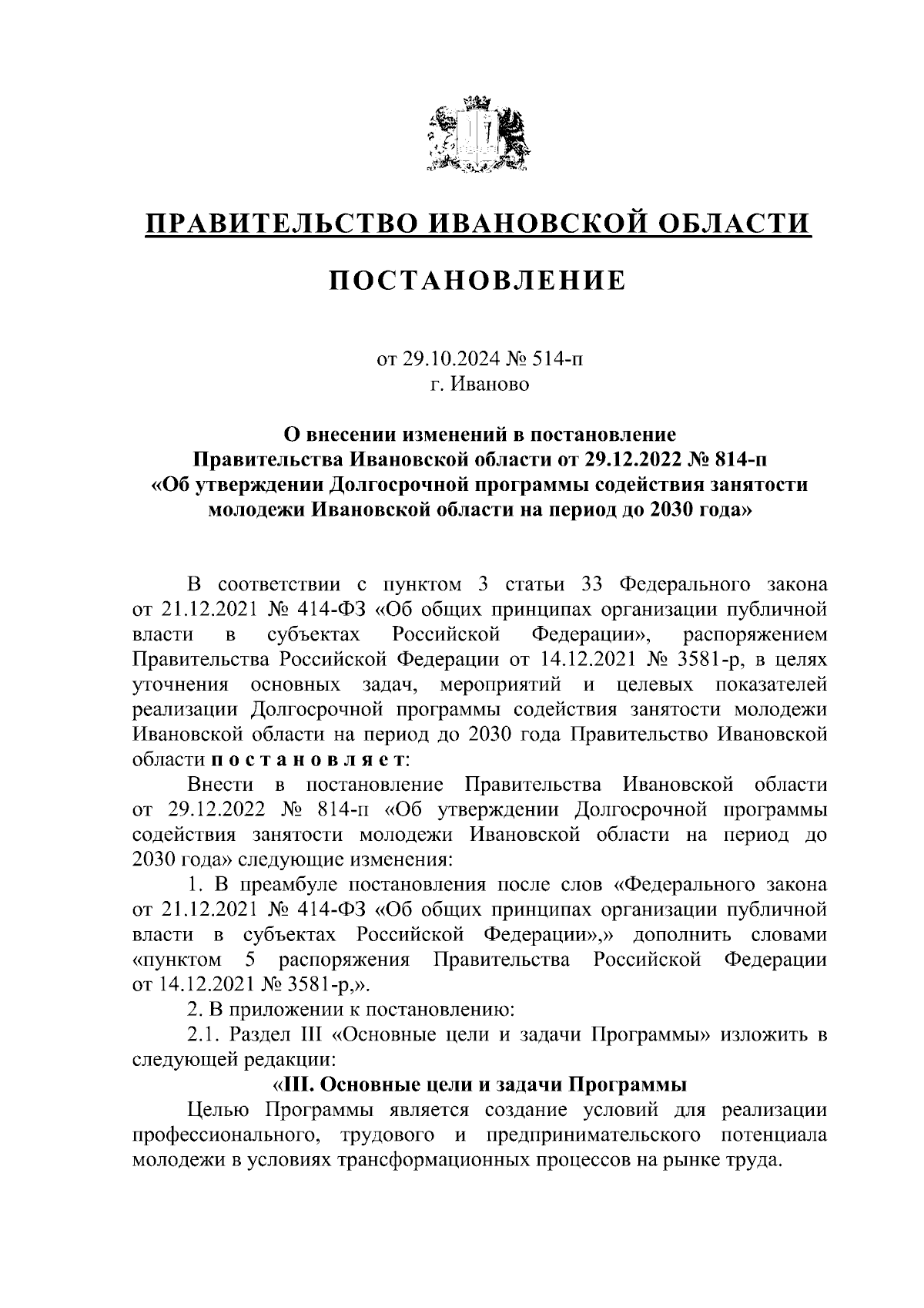 Постановление Правительства Ивановской области от 29.10.2024 № 514-п