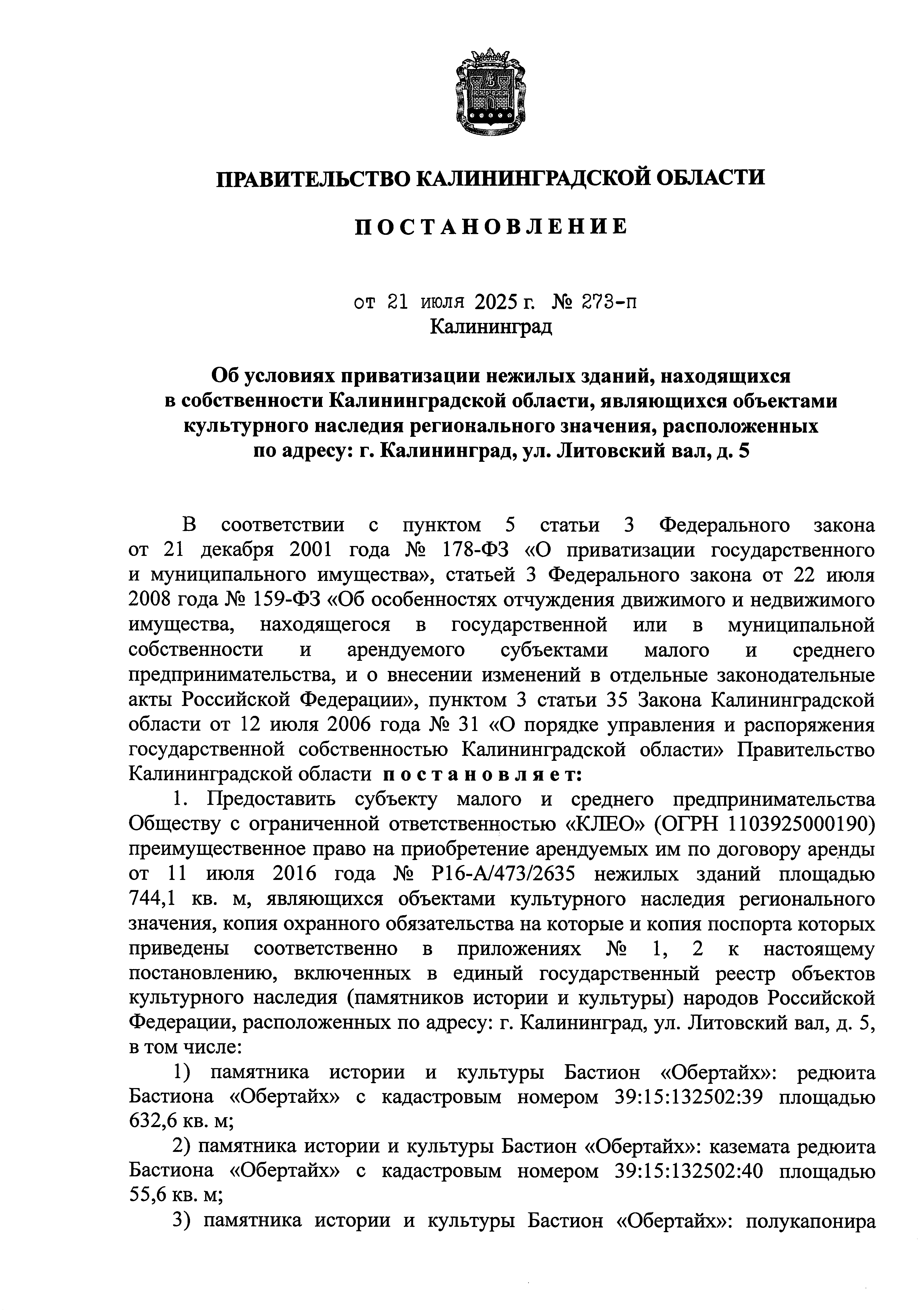 Постановление Правительства Калининградской области от 21.07.2025 № 273-п