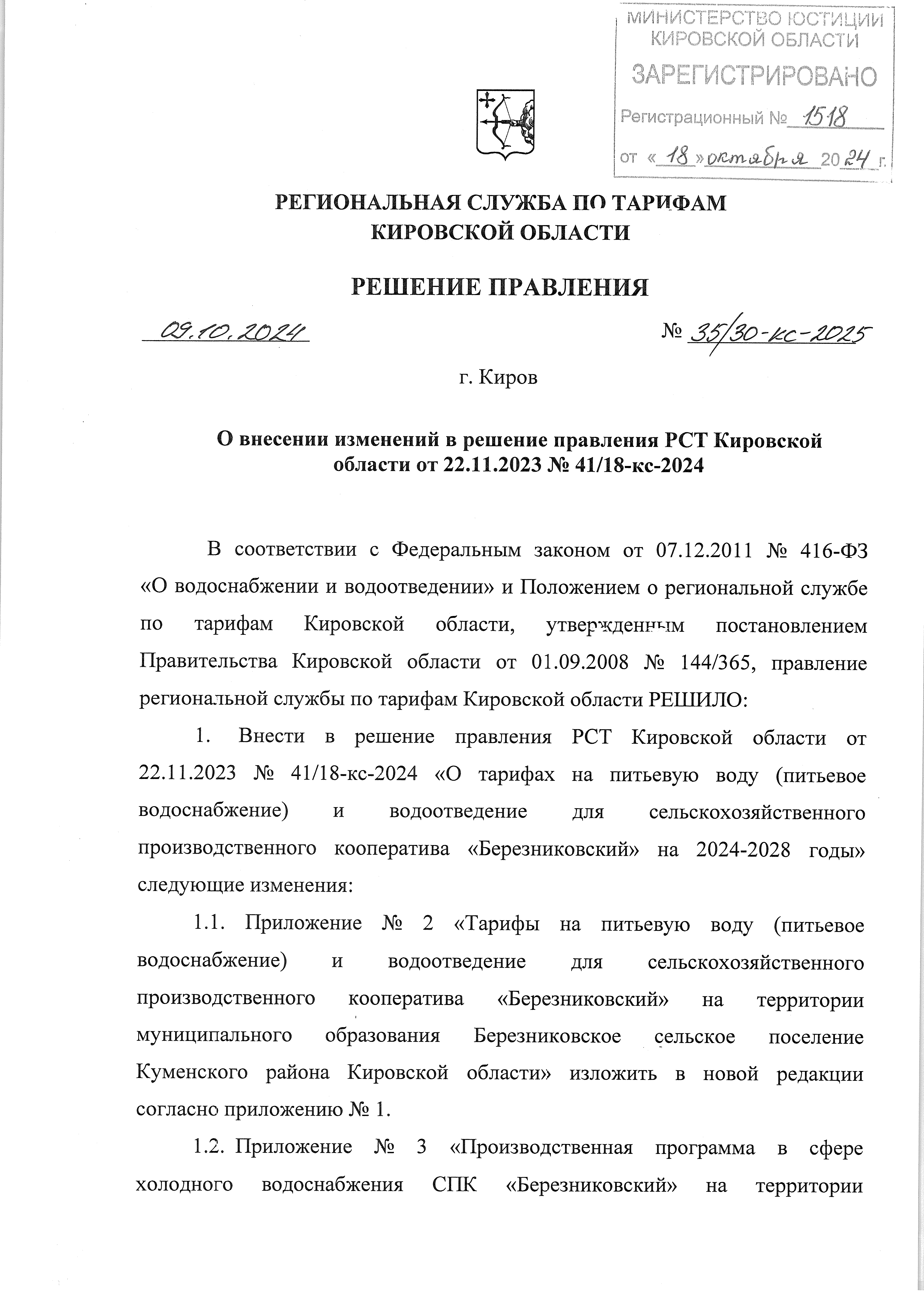 Решение правления региональной службы по тарифам Кировской области от 09.10.2024 № 35/30-кс-2025
