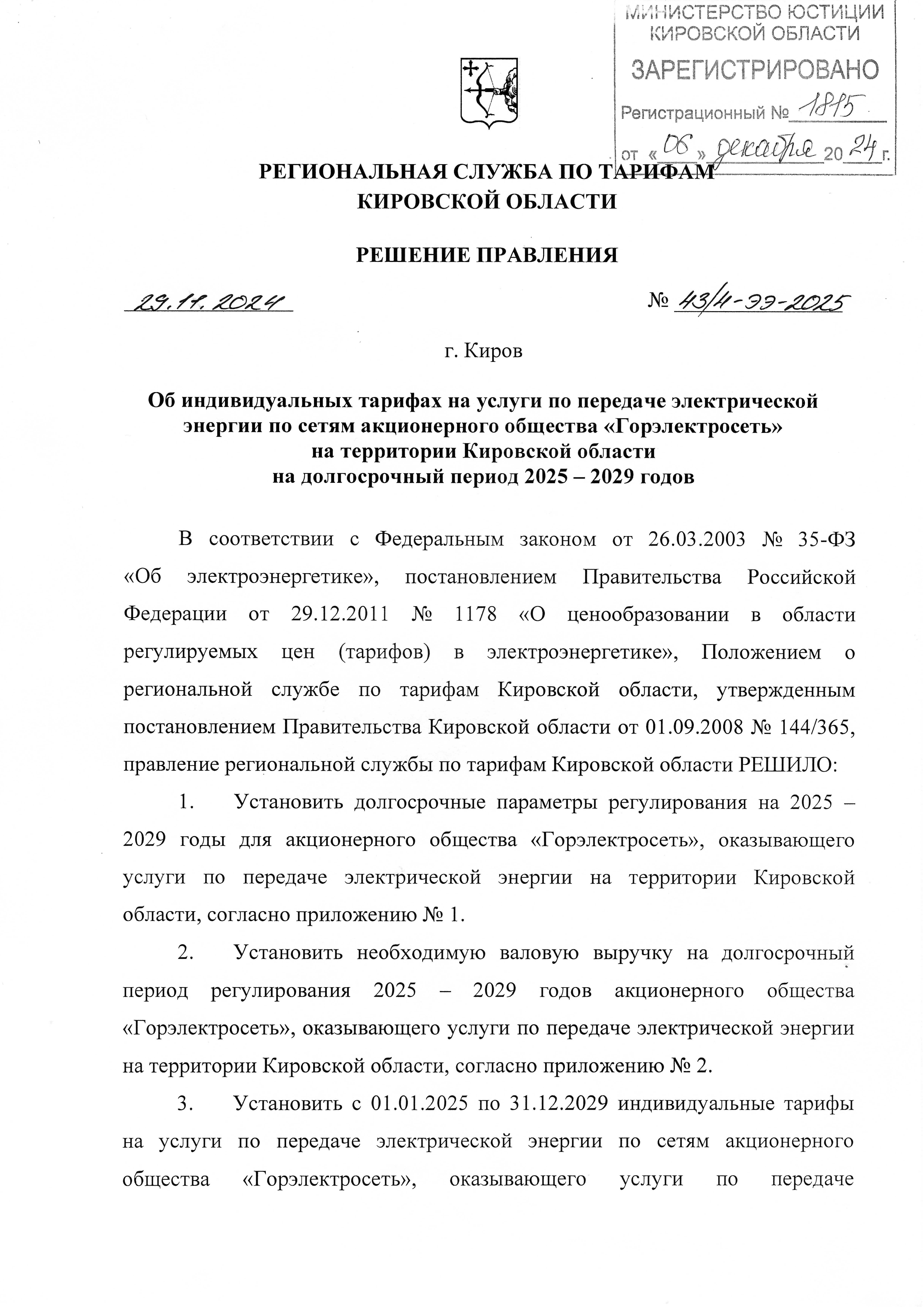 Решение правления региональной службы по тарифам Кировской области от 29.11.2024 № 43/4-ээ-2025