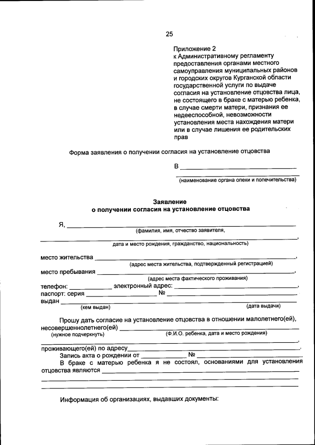 "Об утверждении Административного регламента предоставления органами местного самоуправления муниципальных районов и городских округов Курганской области государственной услуги по выдаче согласия на установление отцовства лица, не состоящего в браке с матерью ребенка, в случае смерти матери, признания ее недееспособной, невозможности установления места нахождения матери или в случае лишения ее родительских прав"