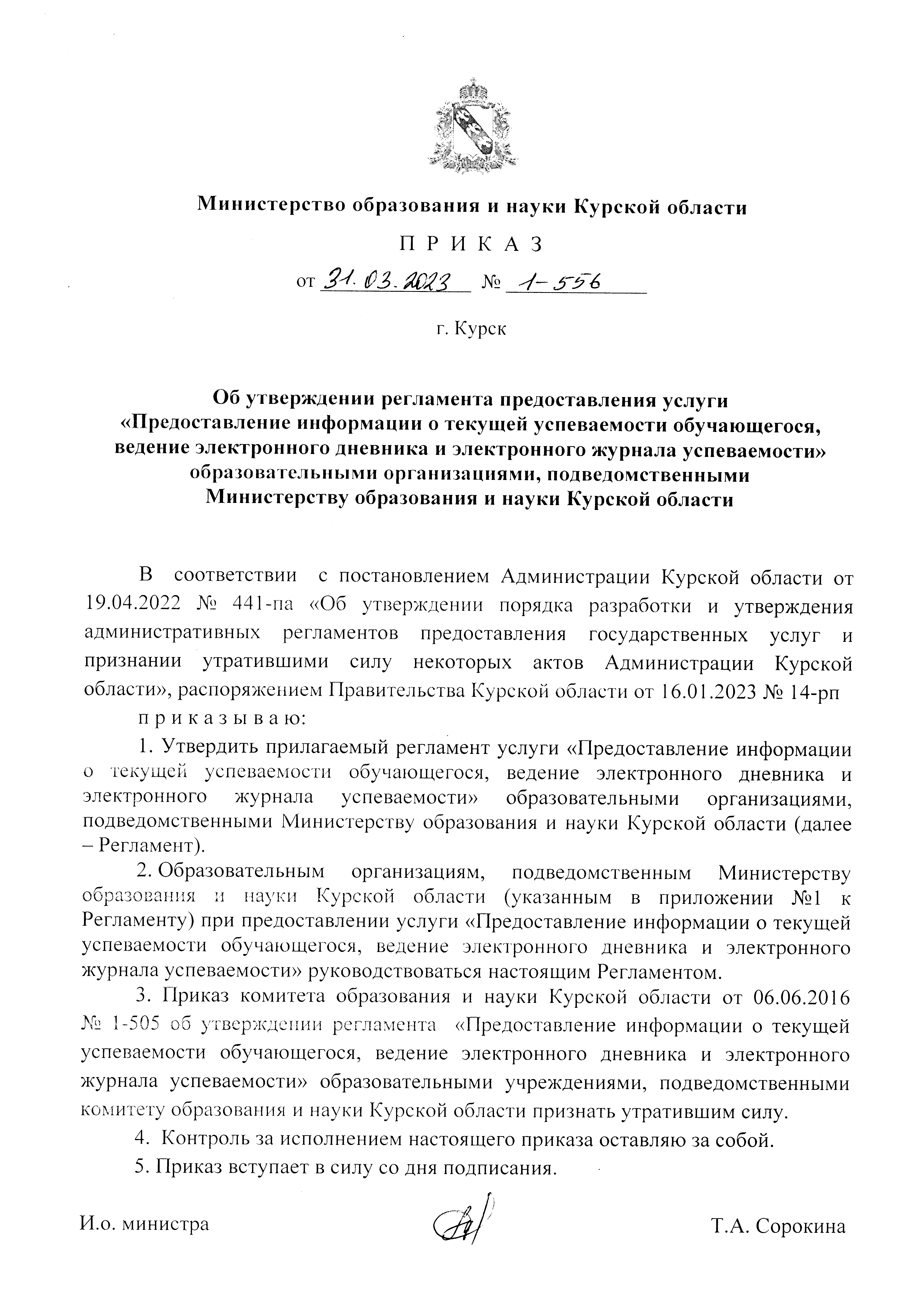 Приказ Министерства образования и науки Курской области от 31.03.2023 № 1-556
