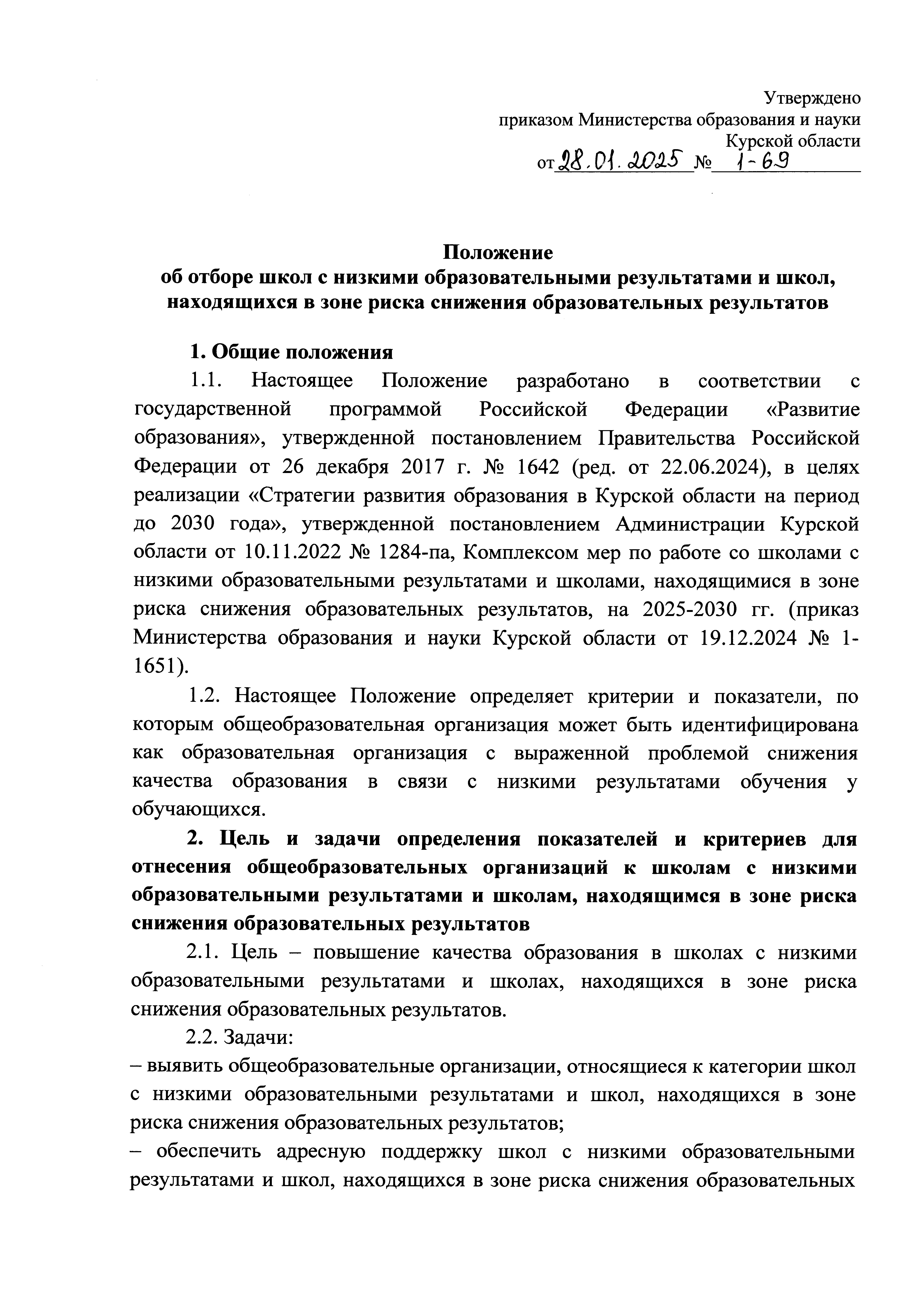 Приказ Министерства образования и науки Курской области от 28.01.2025 № 1-69