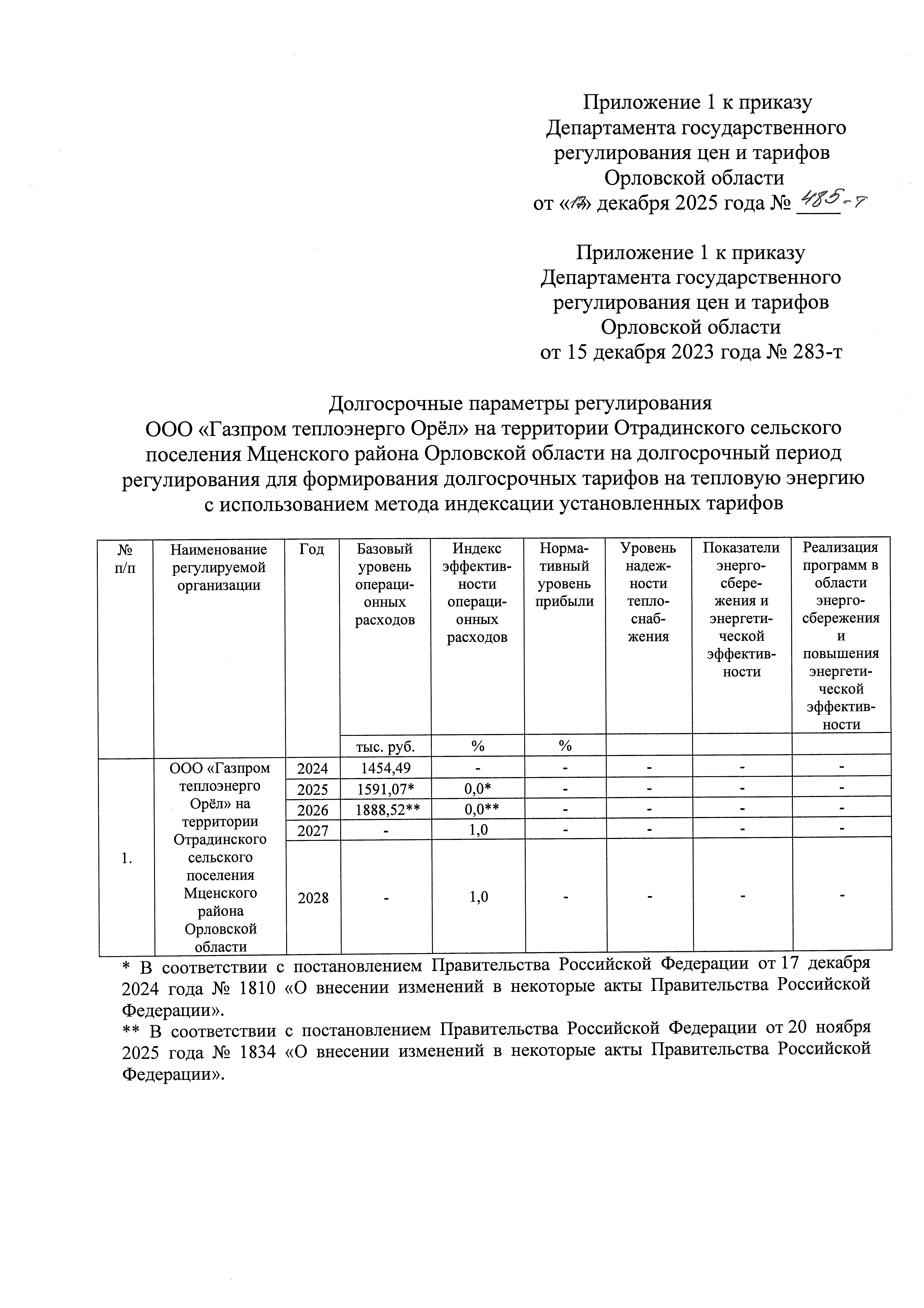 "О внесении изменений в приказ Департамента государственного регулирования цен и тарифов Орловской области от 15 декабря 2023 года № 283-т "Об установлении долгосрочных параметров регулирования и долгосрочных тарифов на тепловую энергию, поставляемую ООО "Газпром теплоэнерго Орёл" на территории Отрадинского сельского поселения Мценского района Орловской области потребителям"