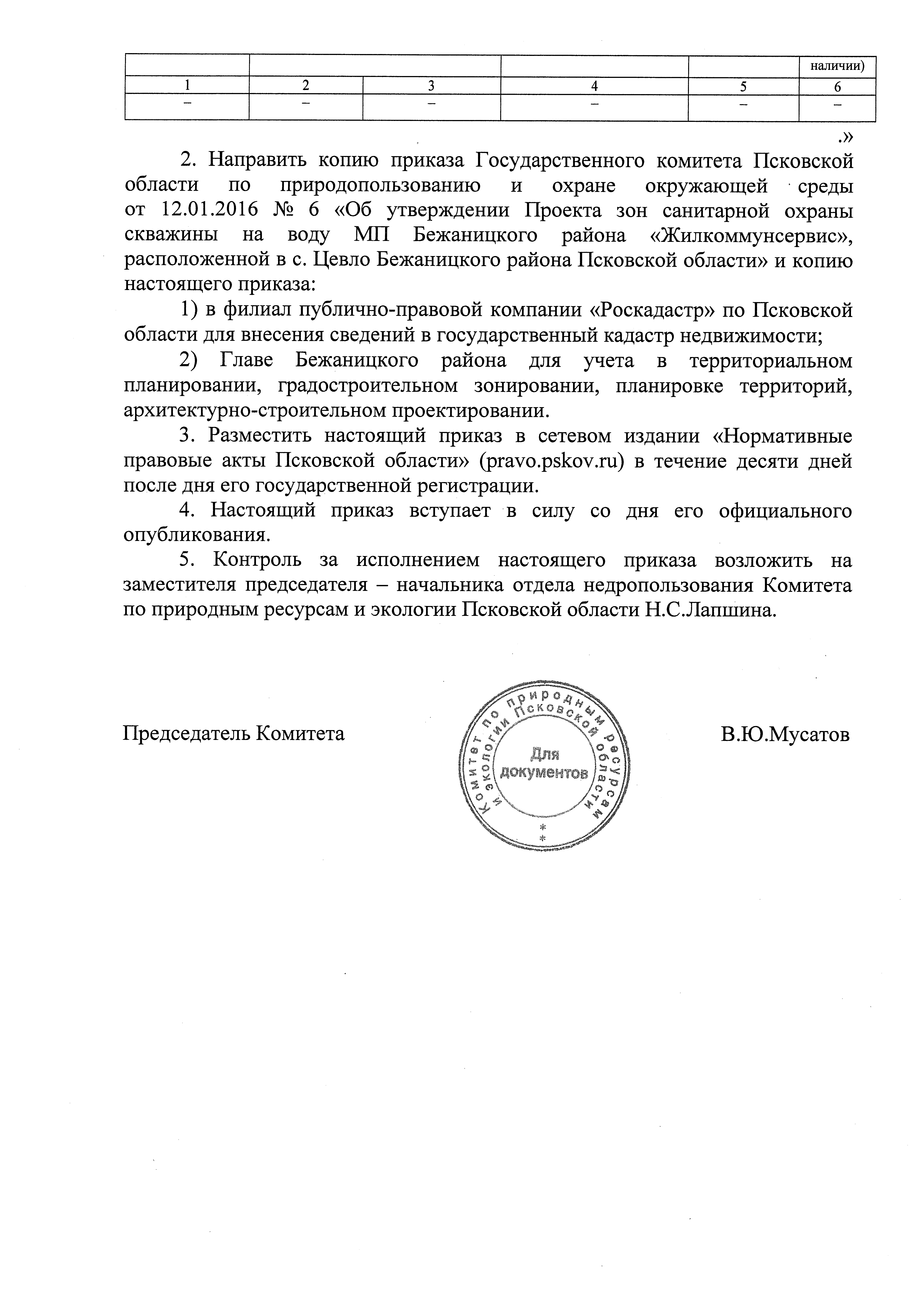 "О внесении изменений в приложение к приказу Государственного комитета Псковской области по природопользованию и охране окружающей среды от 12.01.2016 № 6 "Об утверждении Проекта зон санитарной охраны скважины на воду МП Бежаницкого района "Жилкоммунсервис", расположенной в с. Цевло Бежаницкого района Псковской области"