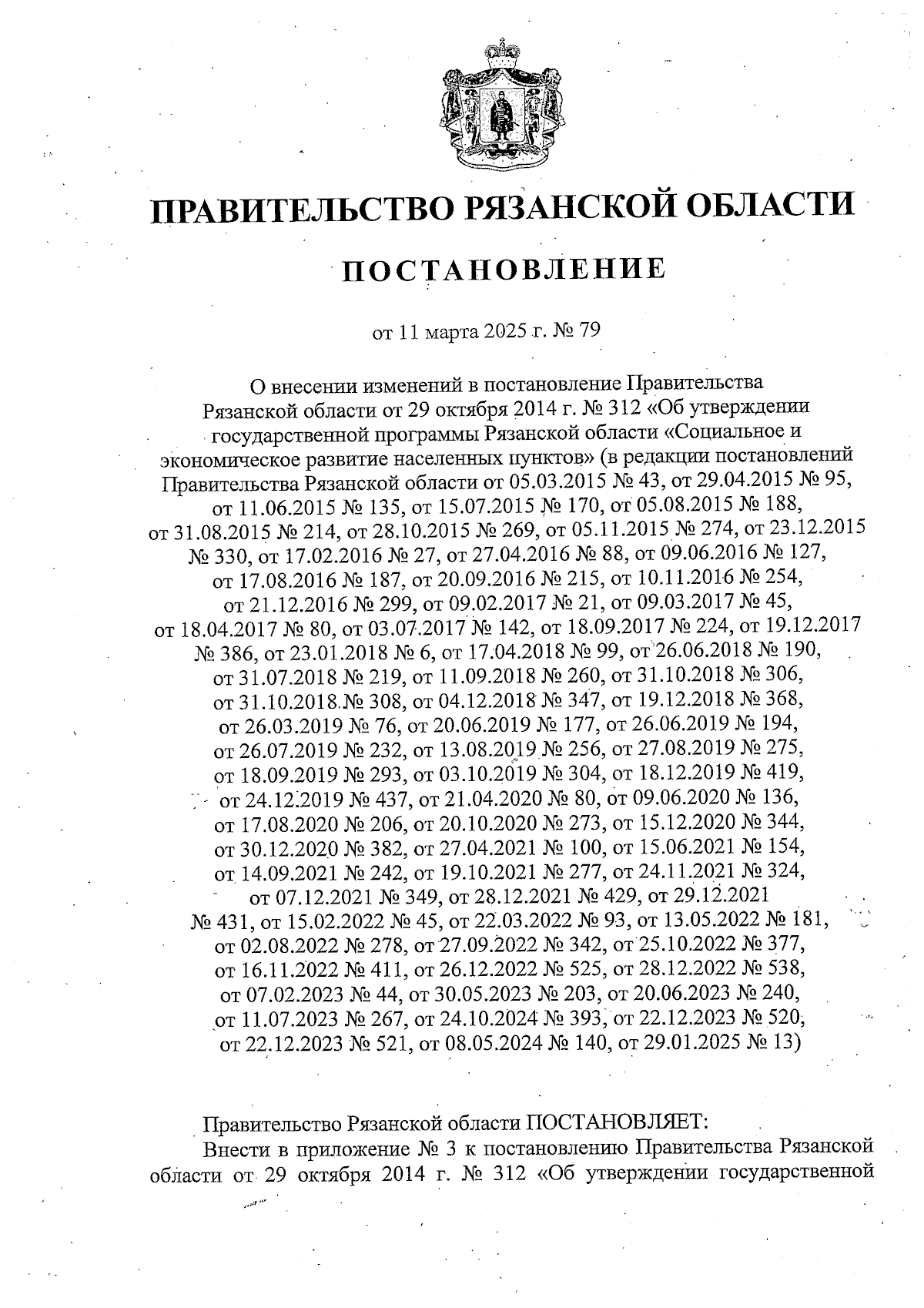 "О внесении изменений в постановление Правительства Рязанской области от 29 октября 2014 г. № 312 "Об утверждении государственной программы Рязанской области "Социальное и экономическое развитие населенных пунктов" (в редакции постановлений Правительства Рязанской области от 05.03.2015 № 43, от 29.04.2015 № 95, от 11.06.2015 № 135, от 15.07.2015 № 170, от 05.08.2015 № 188, от 31.08.2015 № 214, от 28.10.2015 № 269, от 05.11.2015 № 274, т 23.12.2015 № 330, от 17.02.2016 № 27, от 27.04.2016 № 88, от 09.06.2016 № 127, от 17.08.2016 № 187, от 20.09.2016 № 215, от 10.11.2016 № 254, от 21.12.2016 № 299, от 09.02.2017 № 21, от 09.03.2017 № 45, от 18.04.2017 № 80, от 03.07.2017 № 142, от 18.09.2017 № 224, от 19.12.2017 № 386, от 23.01.2018 № 6, от 17.04.2018 № 99, от 26.06.2018 № 190, от 31.07.2018 № 219, от 11.09.2018 № 260, от 31.10.2018 № 306, от 31.10.2018 № 308, от 04.12.2018 № 347, от 19.12.2018 № 368, от 26.03.2019 № 76, от 20.06.2019 № 177, от 26.06.2019 № 194, от 26.07.2019 № 232, от 13.08.2019 № 256, от 27.08.2019 № 275, от 18.09.2019 № 293, от 03.10.2019 № 304, от 18.12.2019 № 419, от 24.12.2019 № 437, от 21.04.2020 № 80, от 09.06.2020 № 136, от 17.08.2020 № 206, от 20.10.2020 № 273, от 15.12.2020 № 344, от 30.12.2020 № 382, от 27.04.2021 № 100, от 15.06.2021 № 154, от 14.09.2021 № 242, от 19.10.2021 № 277, от 24.11.2021 № 324, от 07.12.2021 № 349, от 28.12.2021 № 429, от 29.12.2021 № 431, от 15.02.2022 № 45 от 22.03.2022 № 93, от 13.05.2022 № 181, от 02.08.2022 № 278, от 27.09.2022 № 342, от 25.10.2022 № 377, от 16.11.2022 № 411, от 26.12.2022 № 525, от 28.12.2022 № 538, от 07.02.2023 № 44, от 30.05.2023 № 203, от 20.06.2023 № 240, от 11.07.2023 № 267, от 24.10.2024 № 393, от 22.12.2023 № 520, от 22.12.2023 № 521, от 08.05.2024 № 140, от 29.01.2025 № 13)"