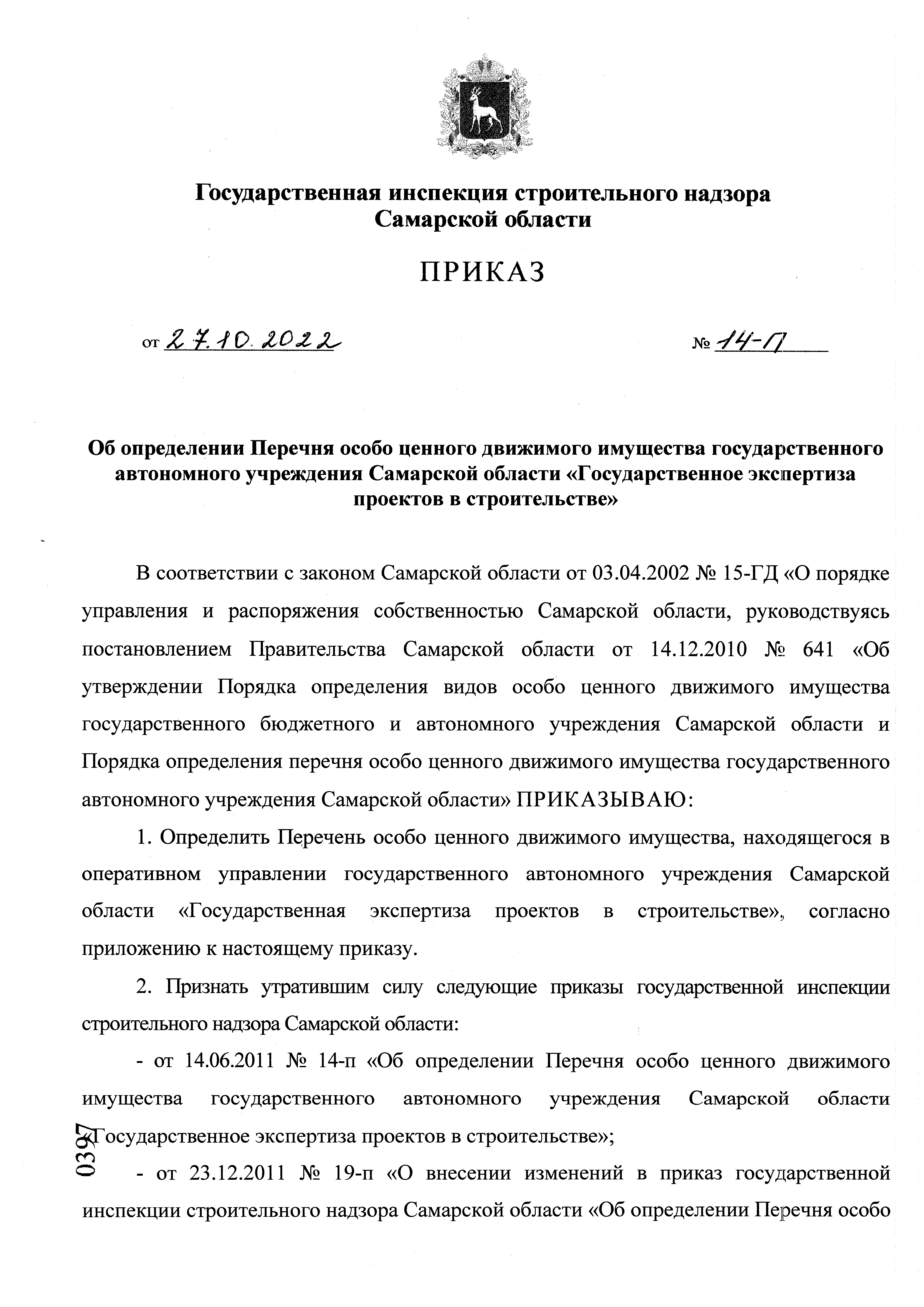 Приказ Государственной инспекции строительного надзора Самарской области от 27.10.2022 № 14-п