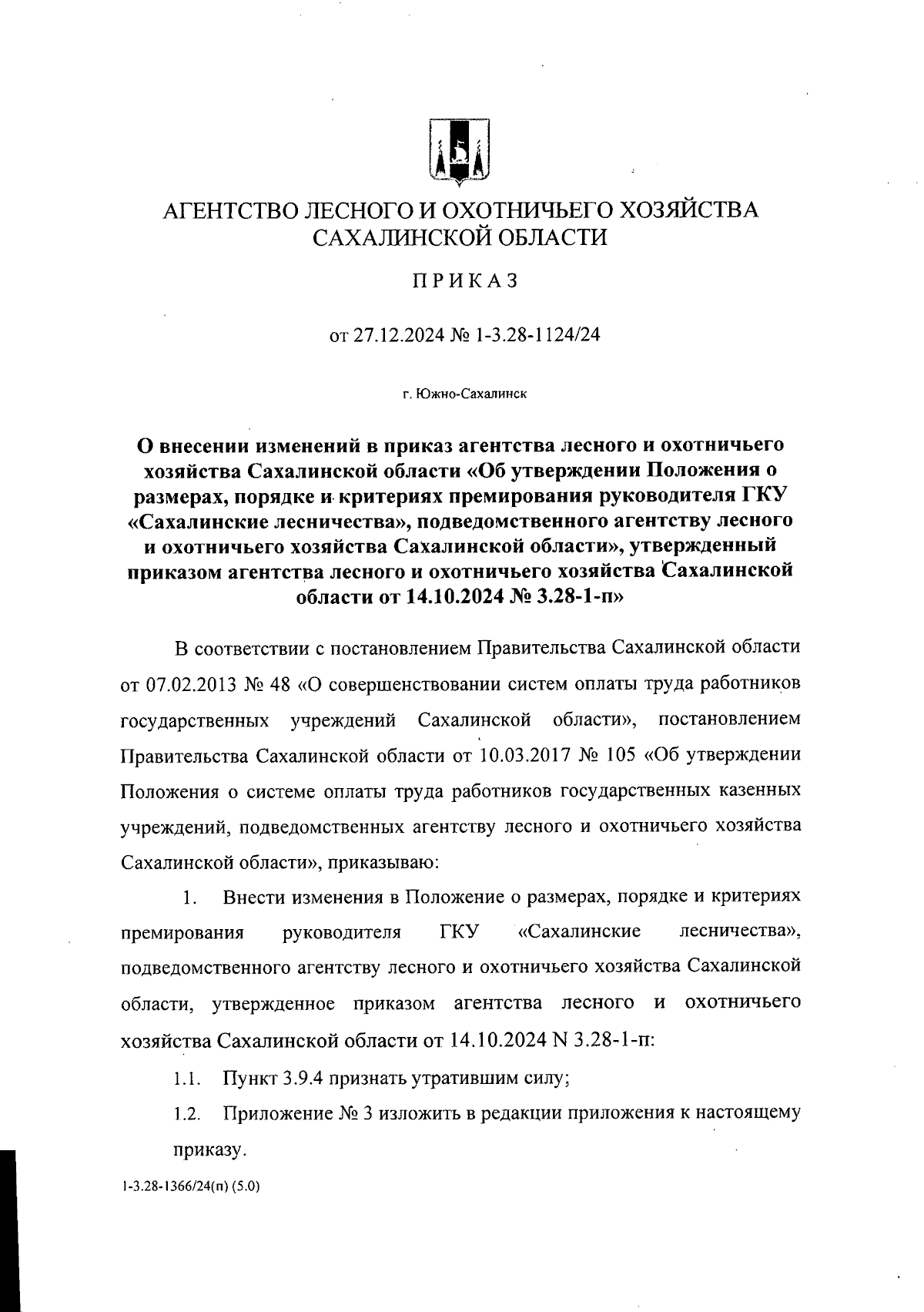 Приказ Агентства лесного и охотничьего хозяйства Сахалинской области от 27.12.2024 № 1-3.28-1124/24