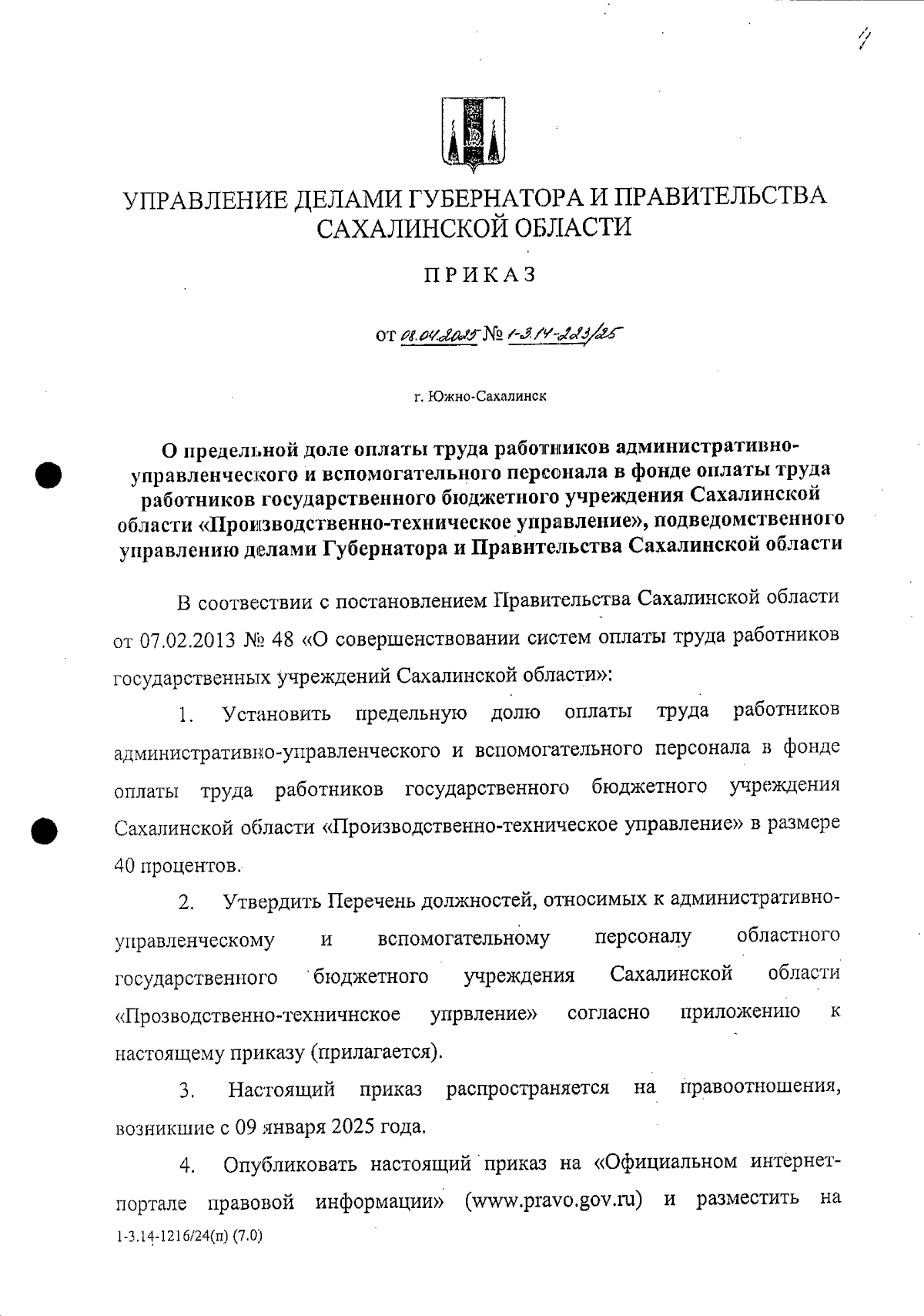 Приказ Управления делами Губернатора и Правительства Сахалинской области от 08.04.2025 № 1-3.14-223/25