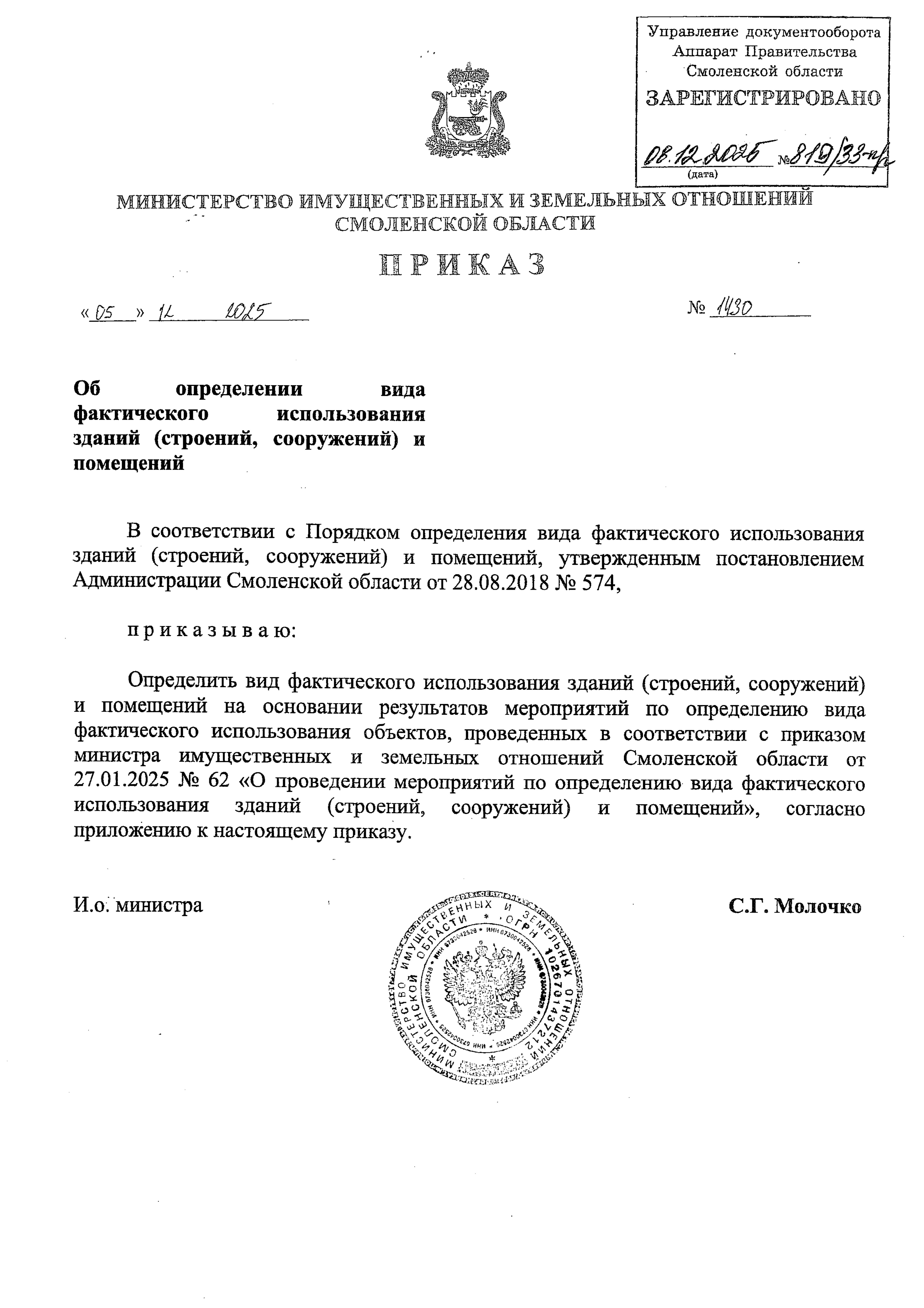 Приказ Министерства имущественных и земельных отношений Смоленской области от 05.12.2025 № 1430