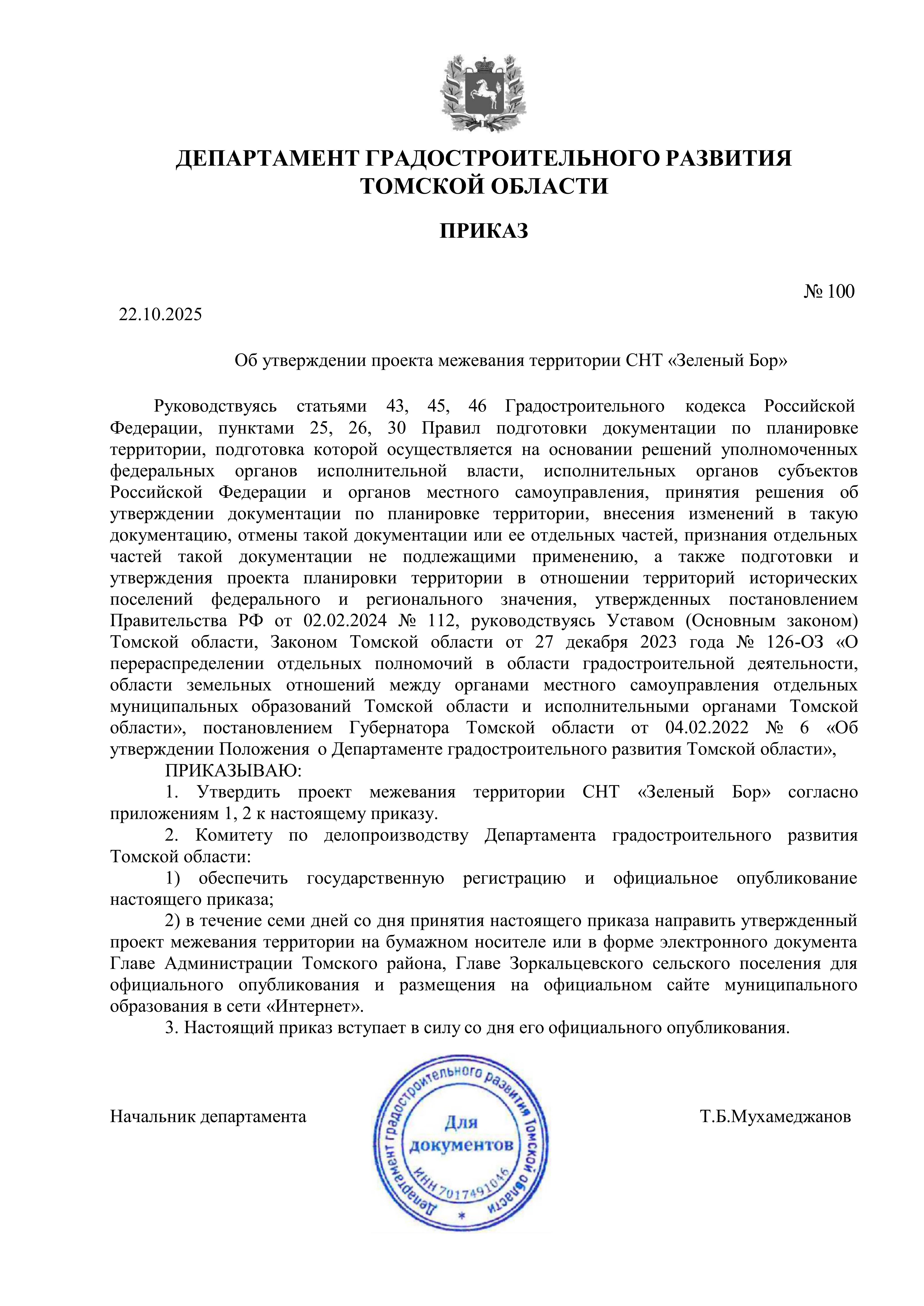 Приказ Департамента градостроительного развития Томской области от 22.10.2025 № 100