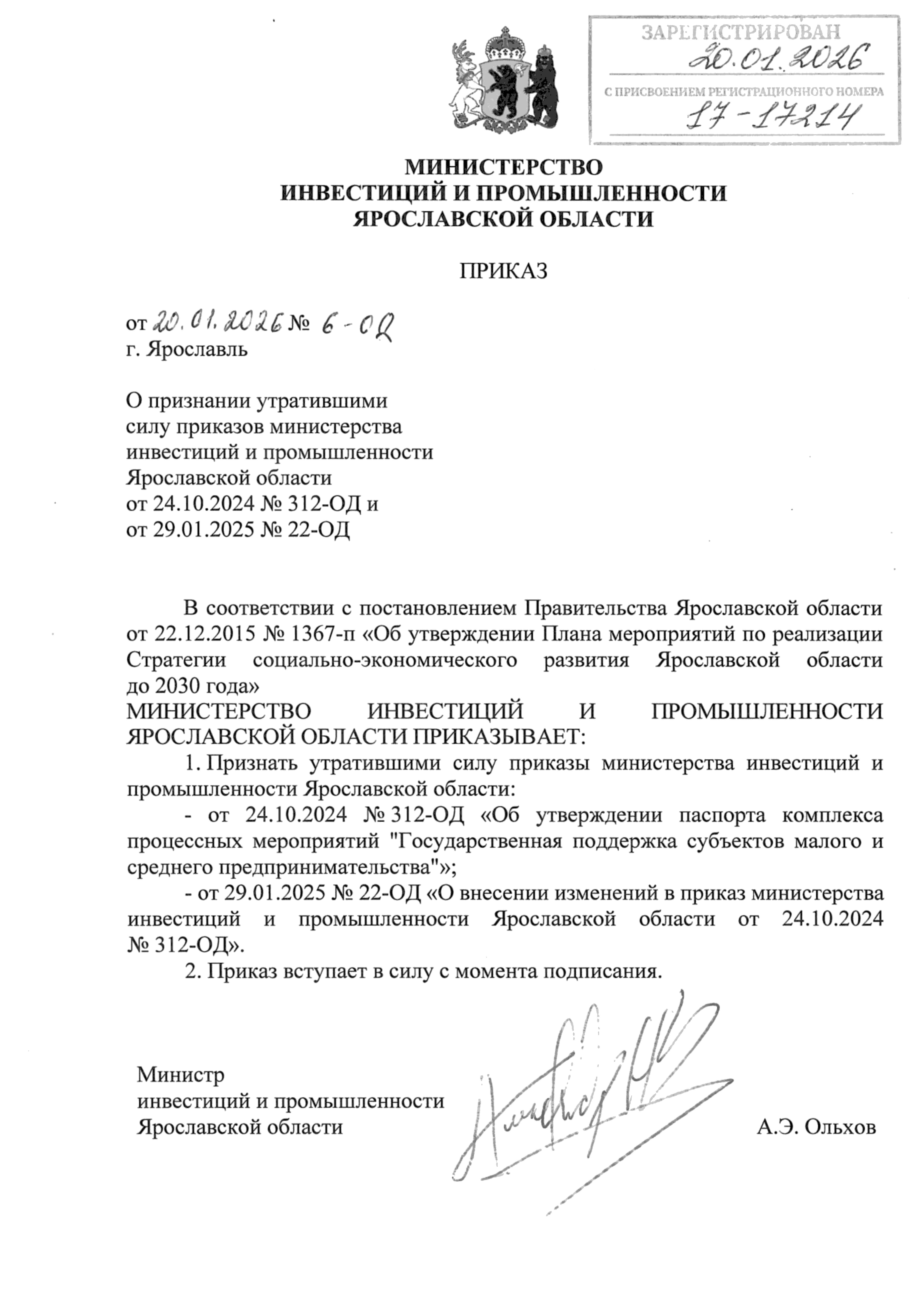 Приказ министерства инвестиций и промышленности Ярославской области от 20.01.2026 № 6-ОД