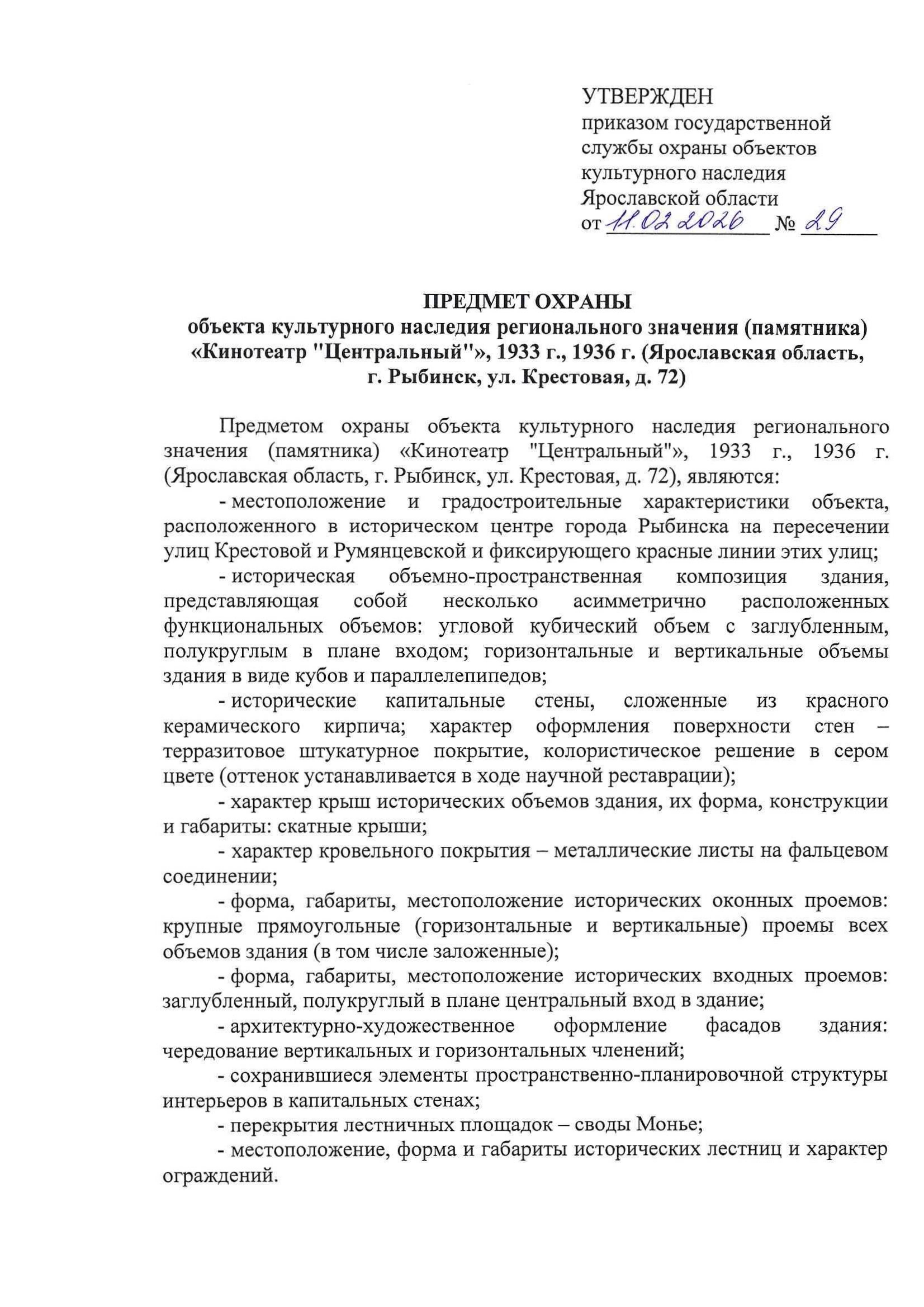 Приказ государственной службы охраны объектов культурного наследия Ярославской области от 11.02.2026 № 29