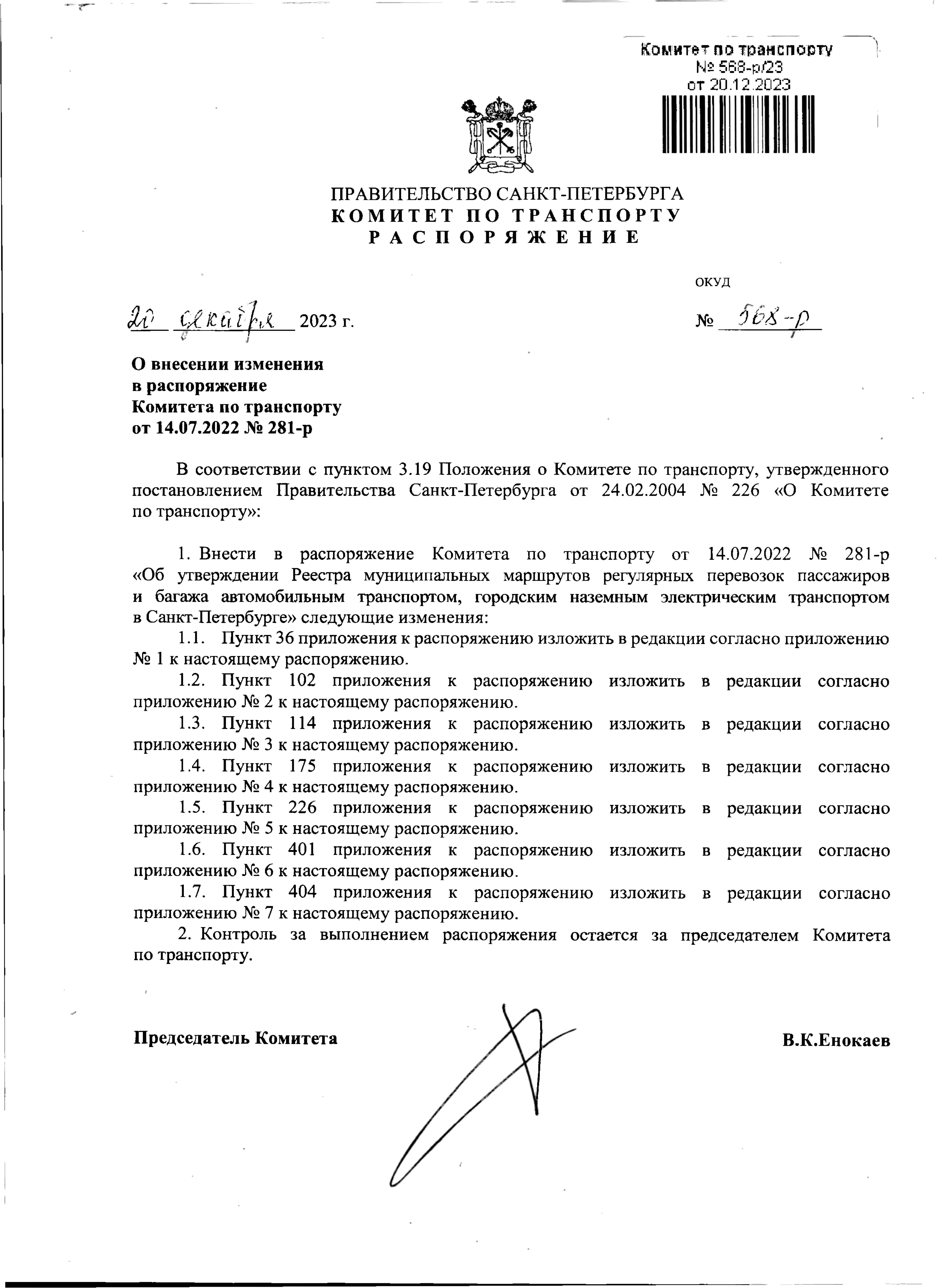 Распоряжение Комитета по транспорту Санкт-Петербурга от 20.12.2023 № 568-р