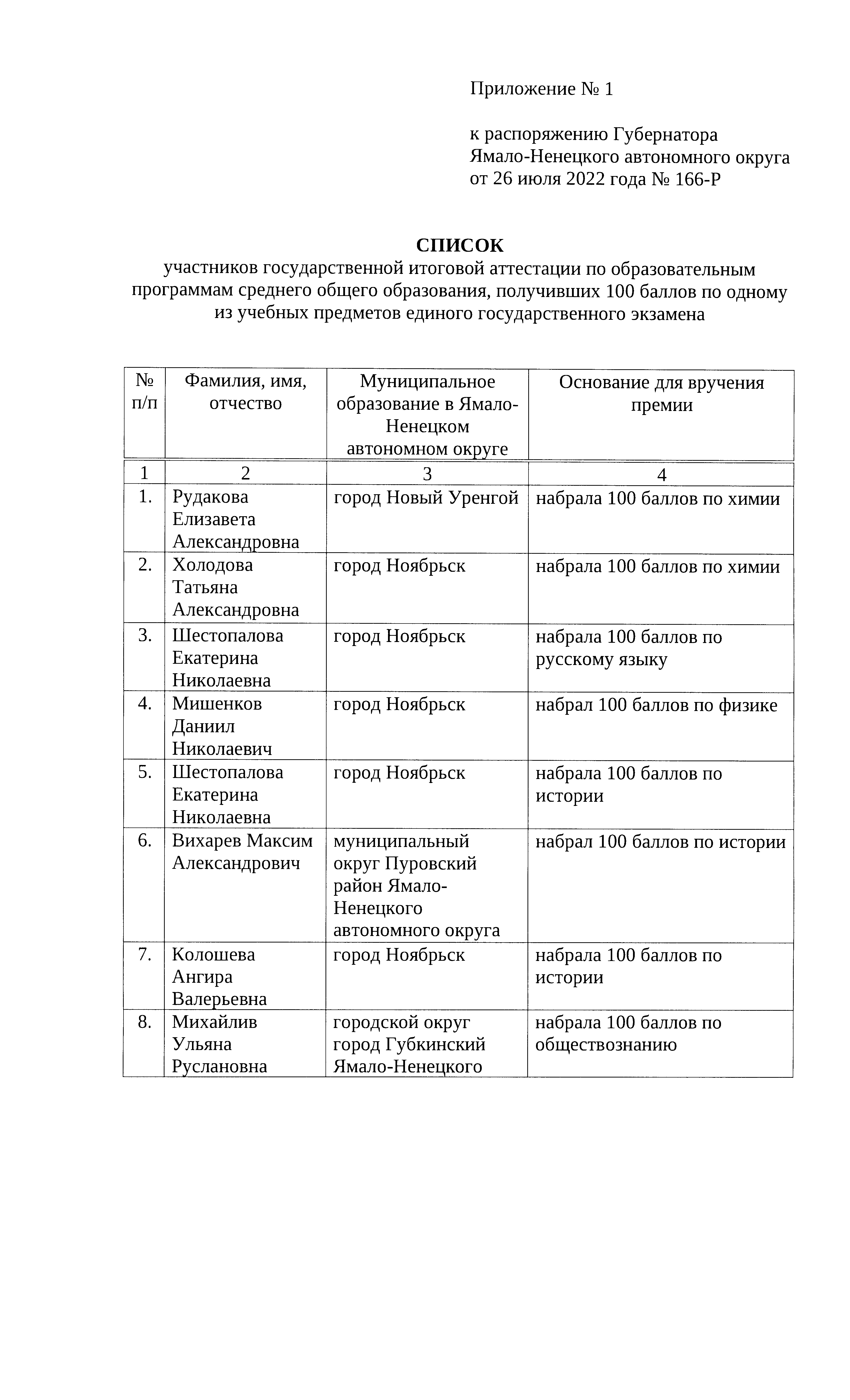Распоряжение Губернатора Ямало-Ненецкого автономного округа от 26.07.2022 № 166-Р